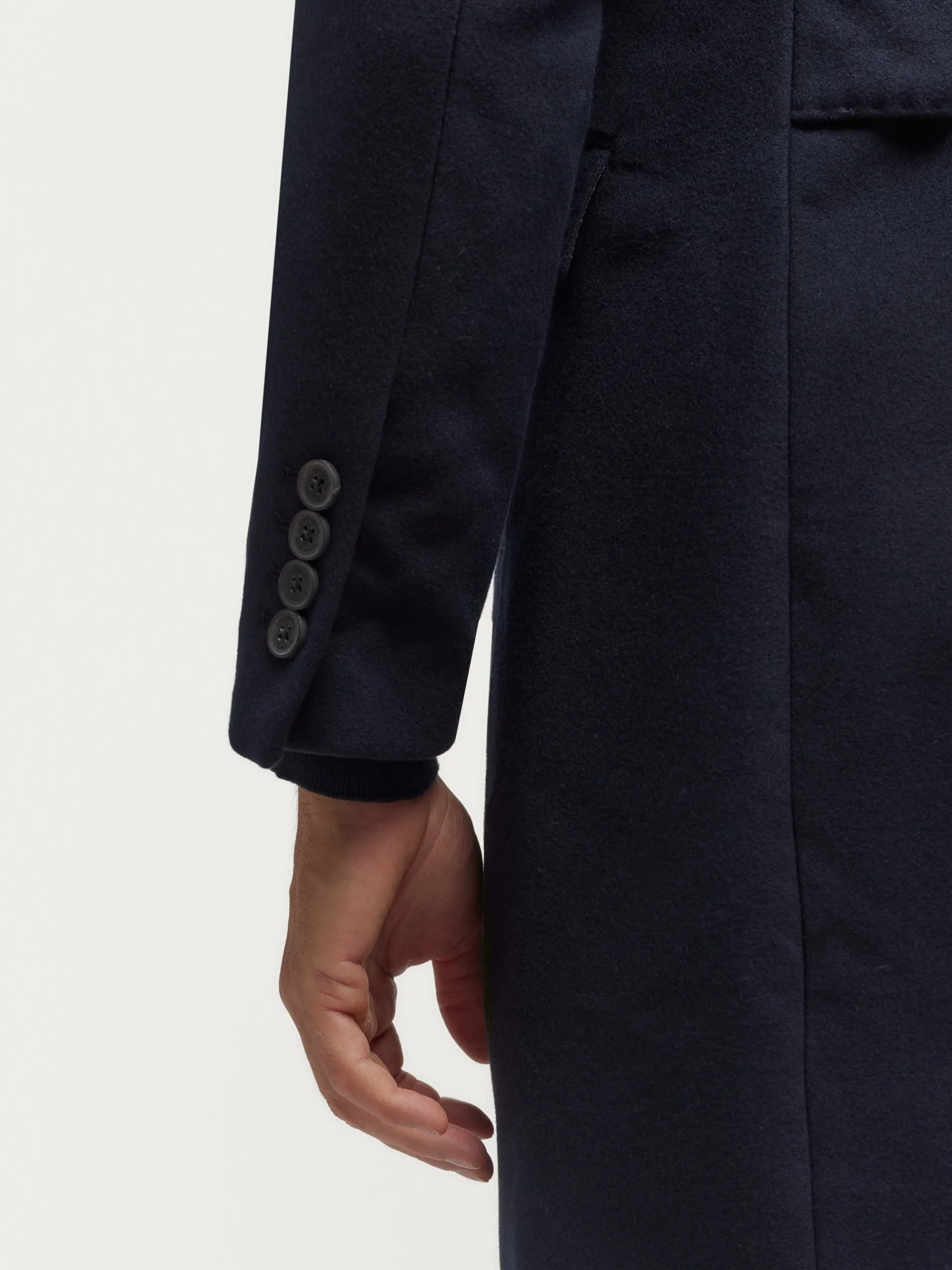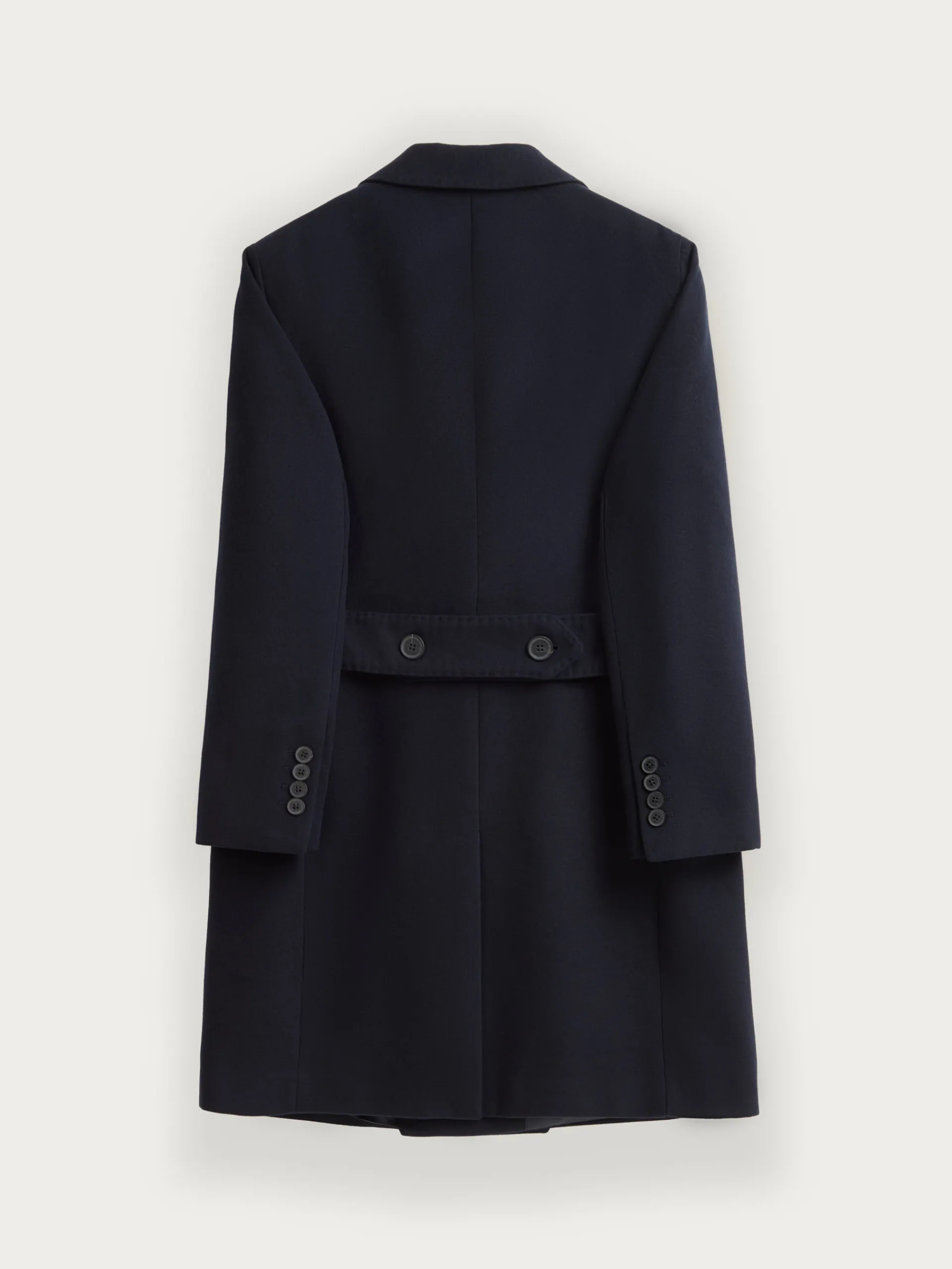 Abrigo largo que cuenta con cuello y solapa, cierre central cruzado, ajuste martingala en la cintura-espalda, bolsillo de ojal en el pecho y dos bolsillos de parche en la cintura. Manga con terminación de botones decorativos. Abertura en el bajo. Forrado en su interior con dos bolsillos.