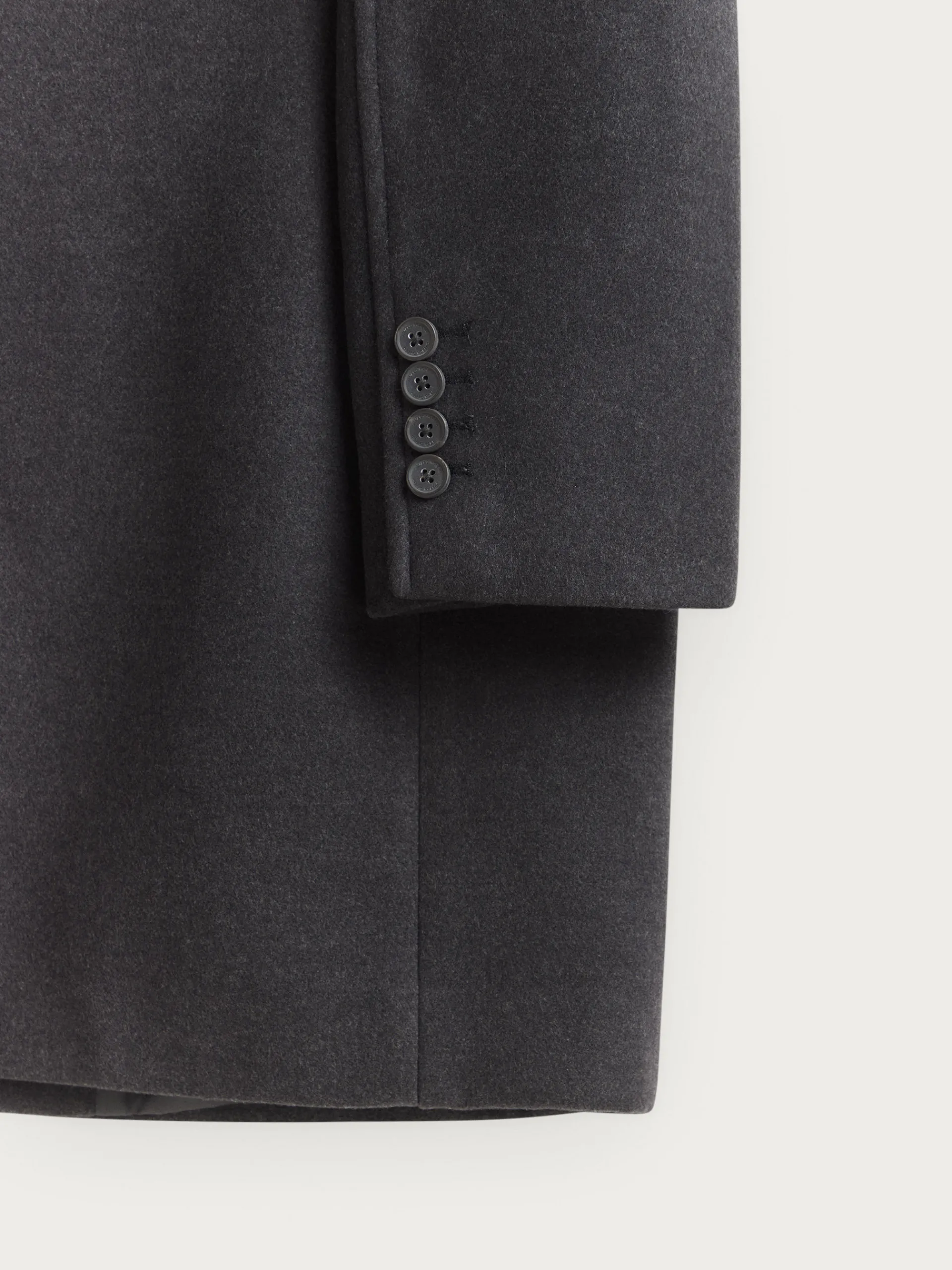 Abrigo de paño liso con cuello y solapa. Cierre central mediante botones, manga larga con botones en su terminación y dos bolsillos a la altura de la cintura. Abertura central en el bajo de la espalda. Corte regular fit.