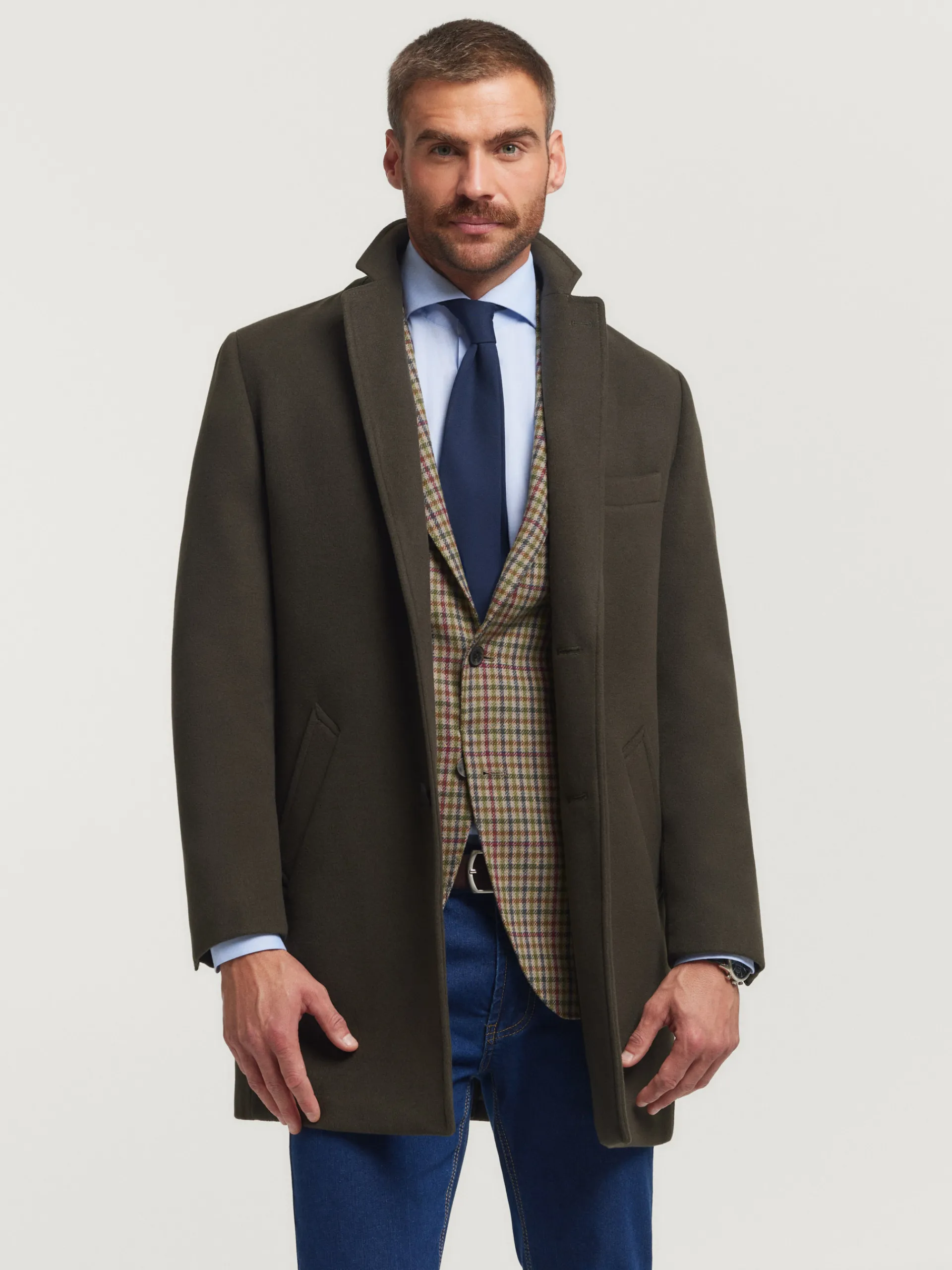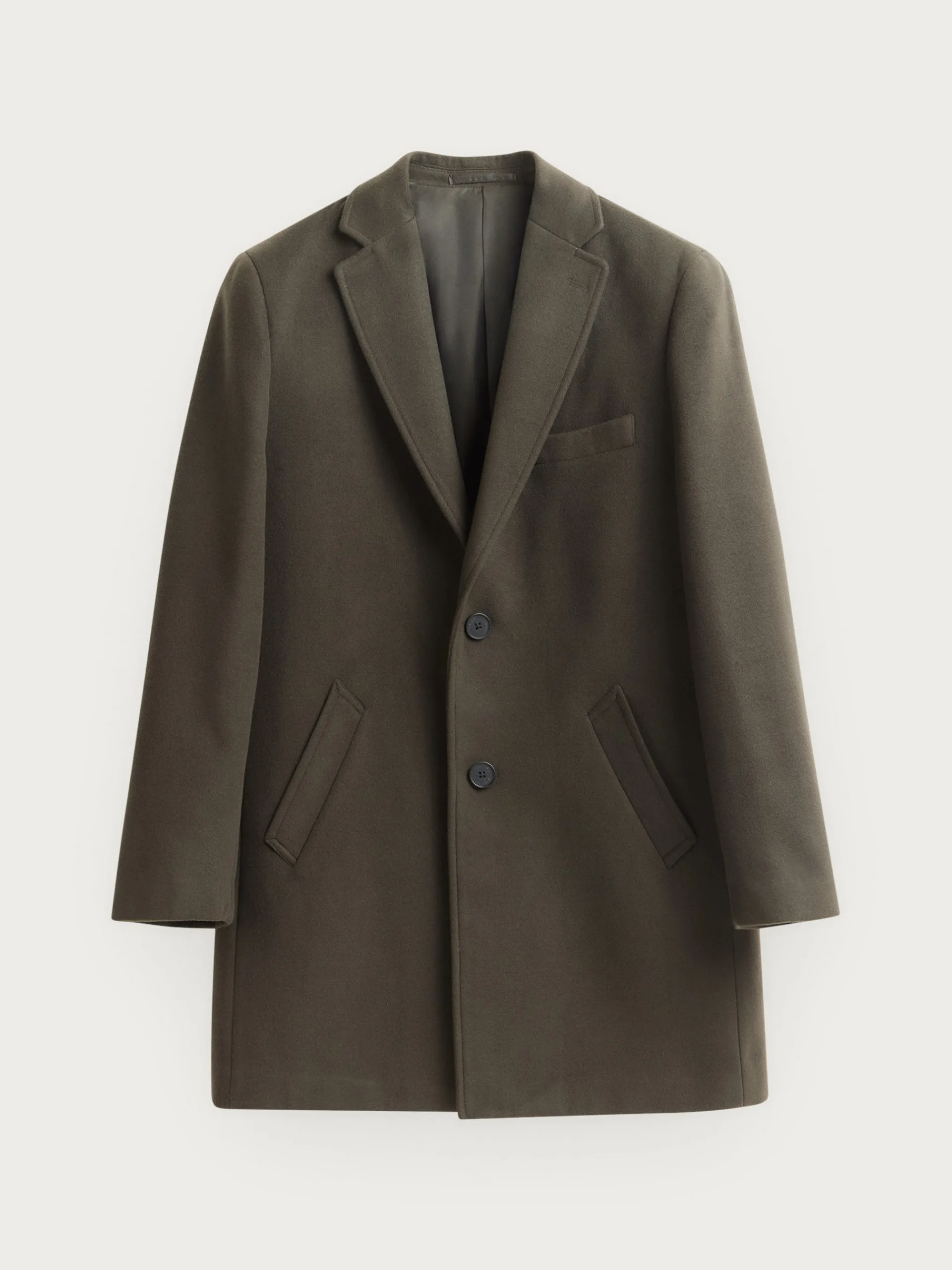 Abrigo de paño liso con cuello y solapa. Cierre central mediante botones, manga larga con botones en su terminación y dos bolsillos a la altura de la cintura. Abertura central en el bajo de la espalda. Corte regular fit.
