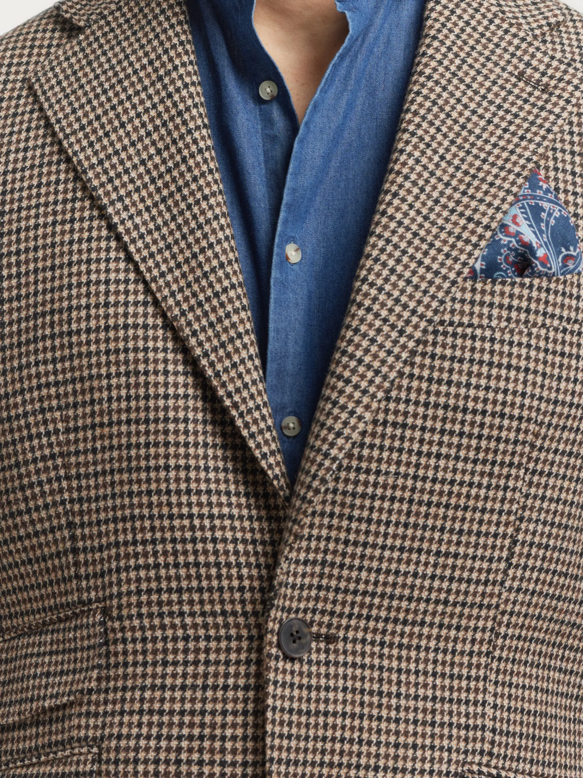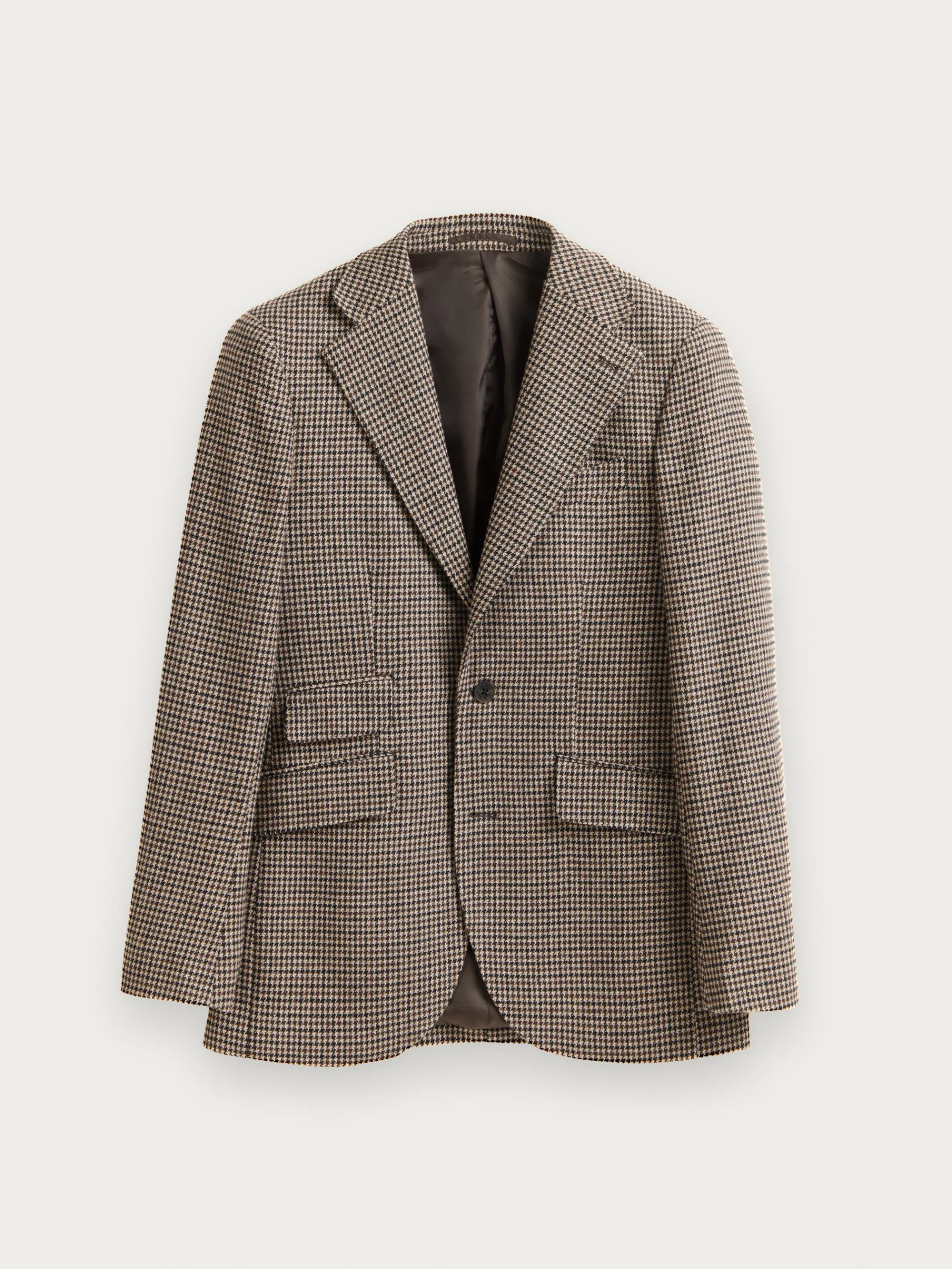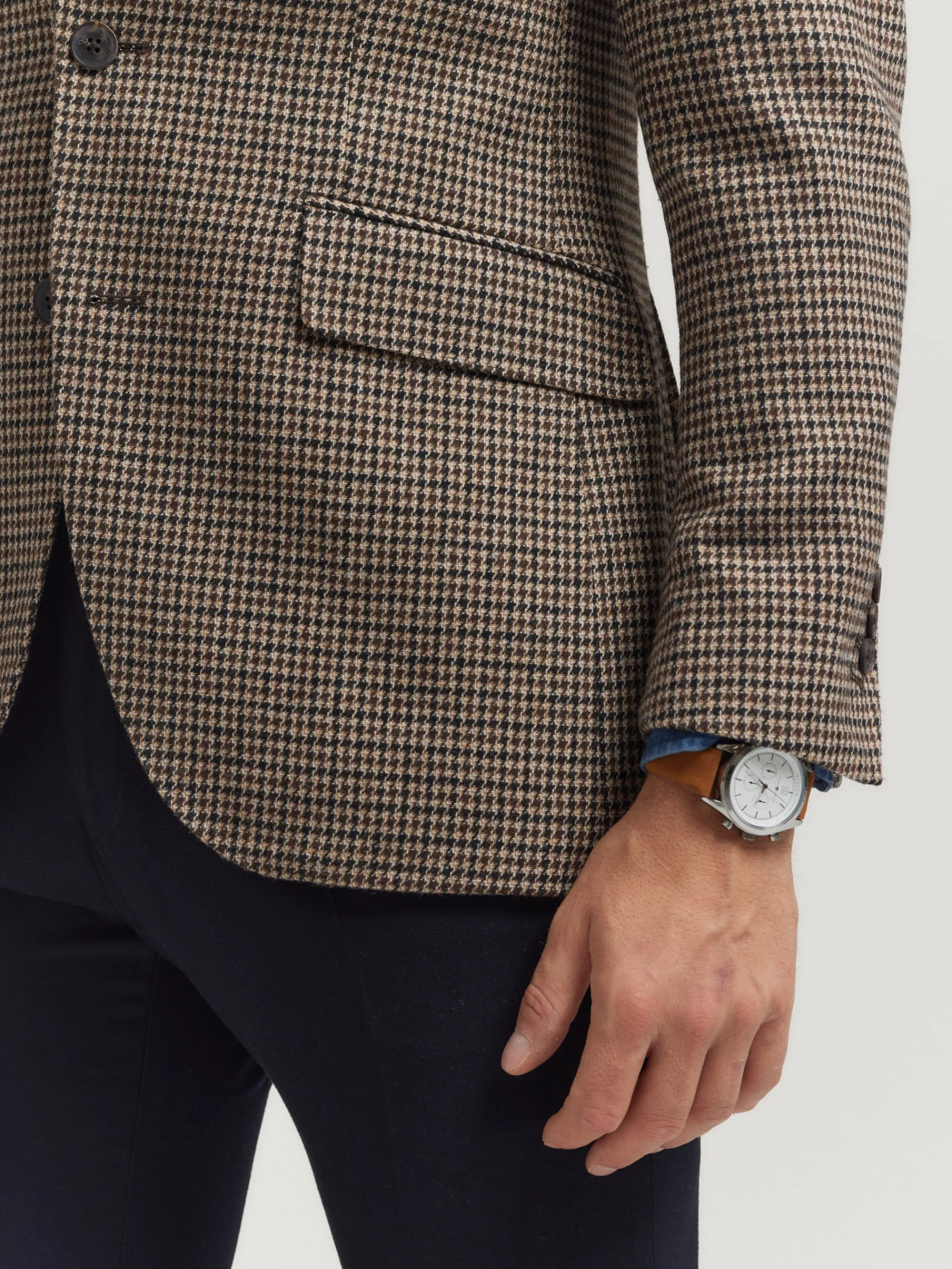 Americana confeccionada en tejido a cuadros de corte slim fit. Cuenta con cuello y solapa, cierre central simple mediante dos botones y puños con botones decorativos. Pinzas en el frontal, tres bolsillos de solapa en la cintura y un bolsillo a la altura del pecho. Interior forrado con dos bolsillos.