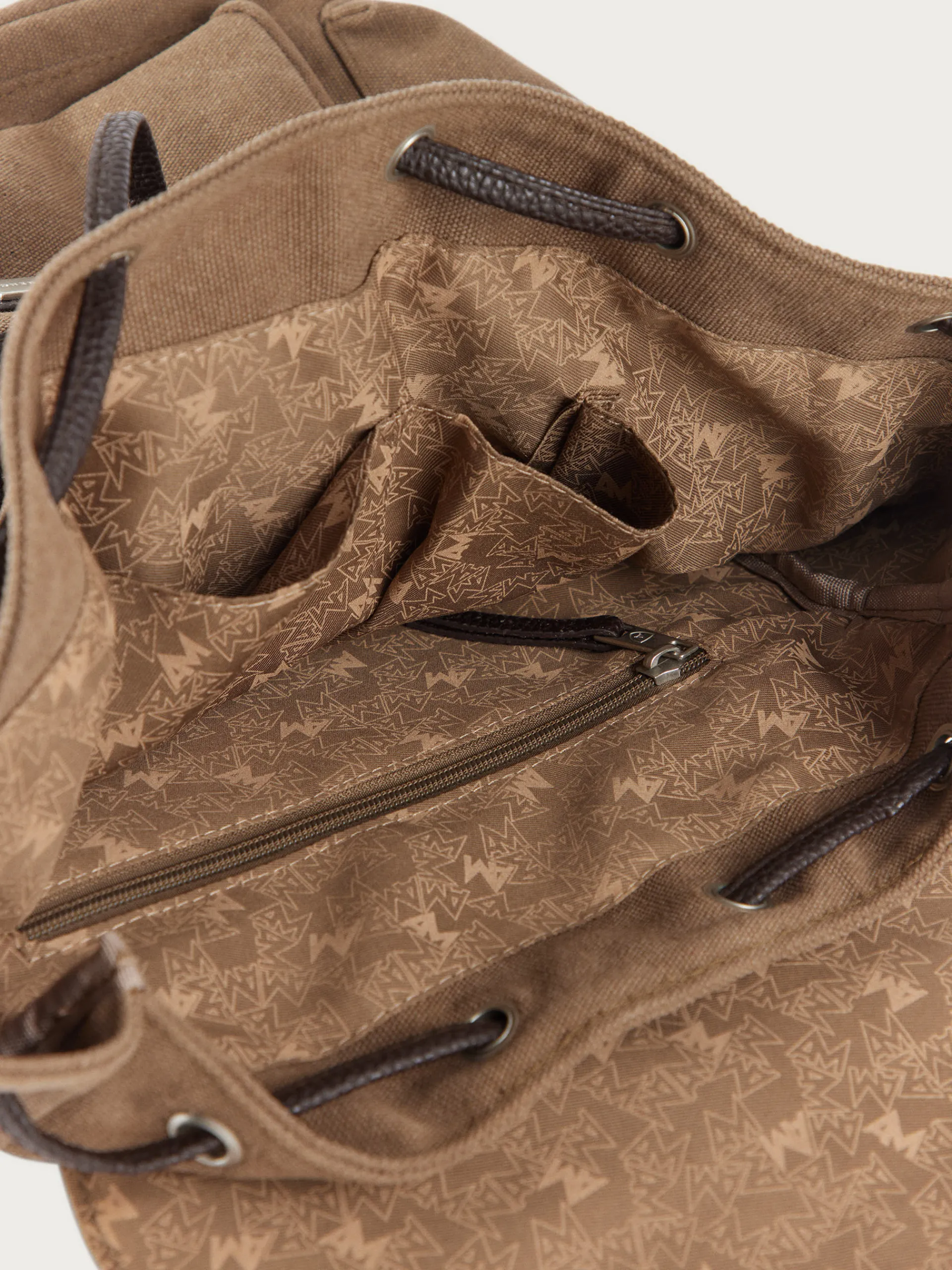Mochila estilo explorer con dos asas de hombro ajustables, gran compartimento principal con cierre mediante solapa y diferentes bolsillos en su interior. Cordón ajustable. Bolsillo en el frontal y en ambos laterales con cierre mediante cremallera. Forrado en su interior.