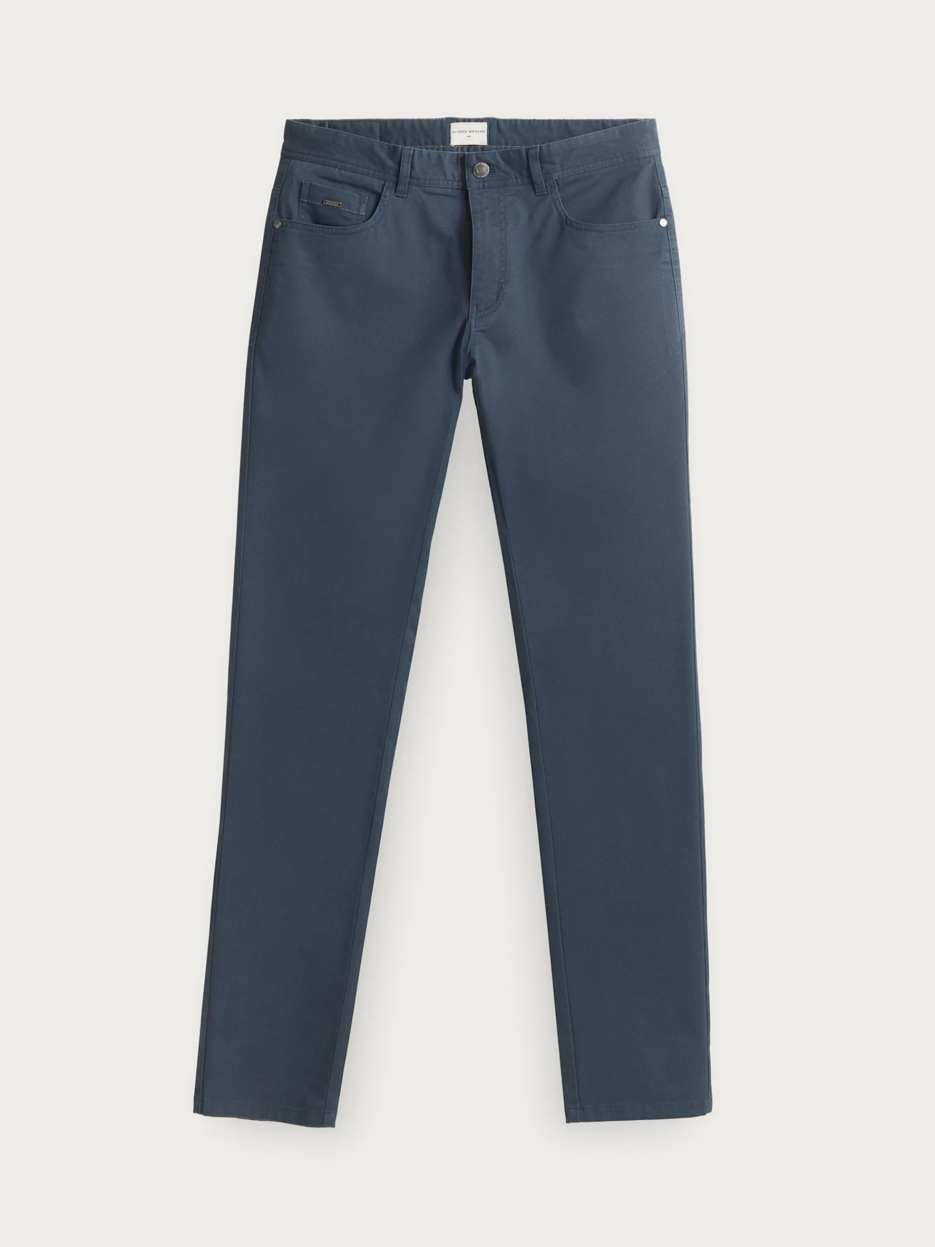 Pantalón de corte slim fit con 5 bolsillos. Cierre central mediante botón y cremallera, bolsillo cerillero y dos bolsillos traseros con pespunte al tono. Etiqueta personalizada en la cinturilla en aspecto piel.