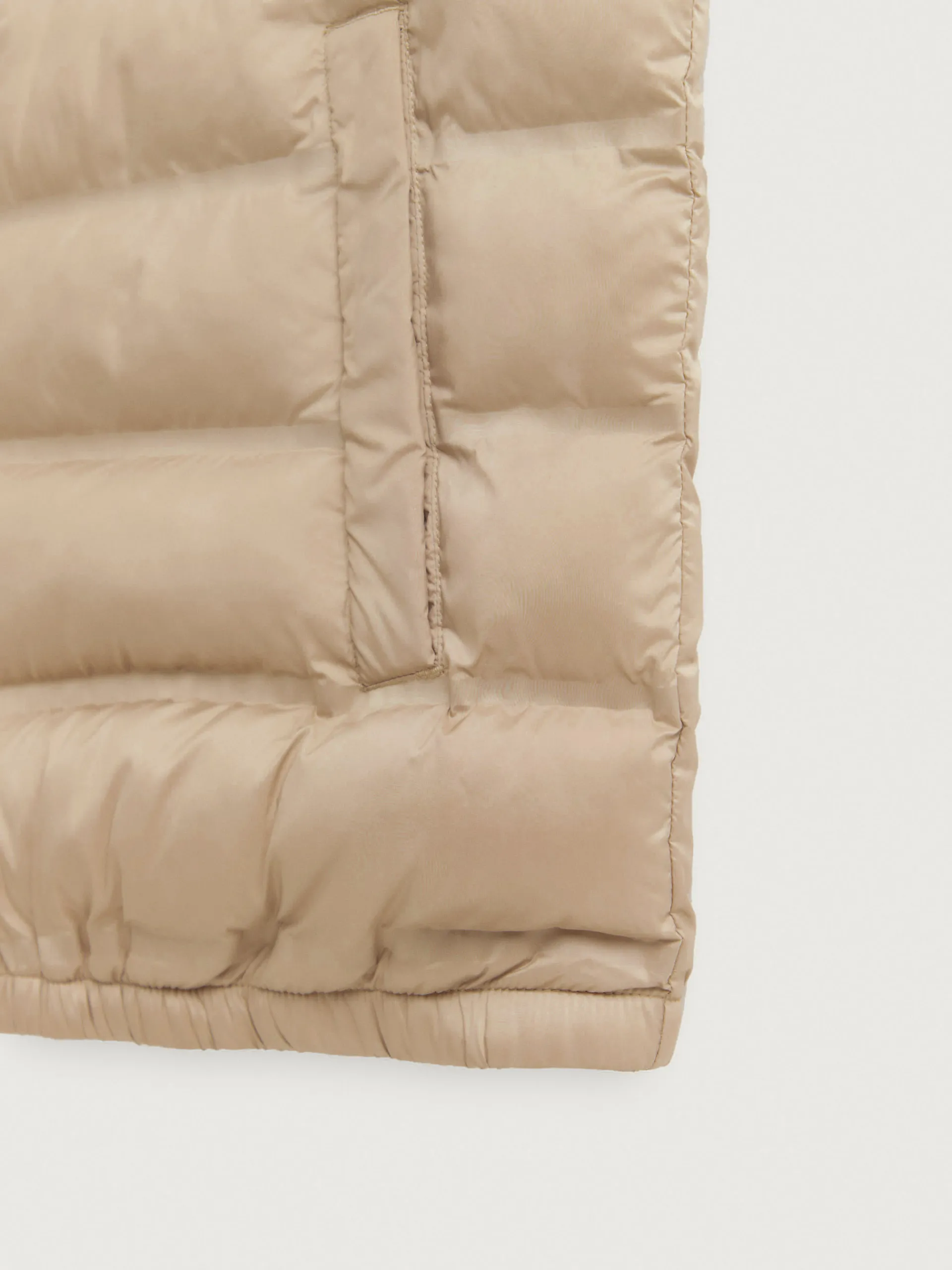 Chaleco acolchado con cuello subido y cierre central mediante cremallera, dos bolsillos a la altura de la cintura y logo de la marca grabado en el pecho al tono. Elástico en la sisa y cintura. Forro interior a contraste con bolsillos.