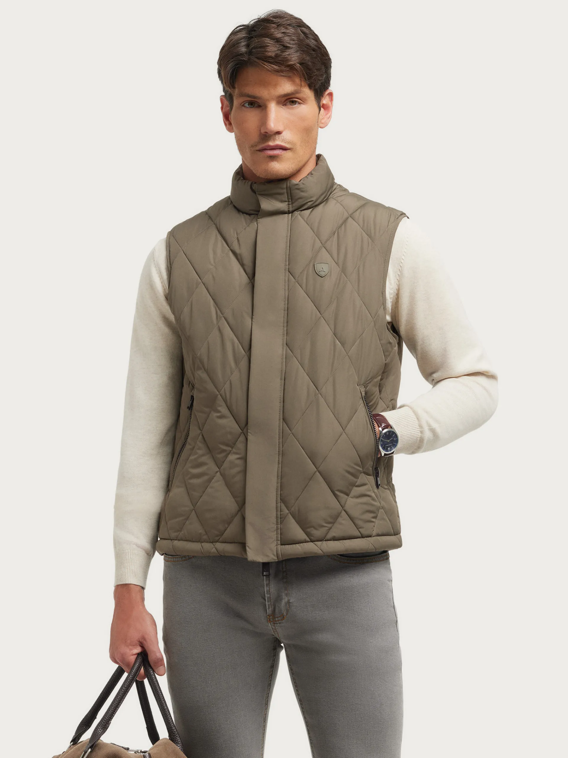 Chaleco con cuello alto y tejido en forma de rombos. Cuenta con cierre central mediante doble cremallera oculta por tapeta de botones a presión, logo de la marca grabado al tono en el frontal y dos bolsillos a la altura de la cintura. Corte regular fit.