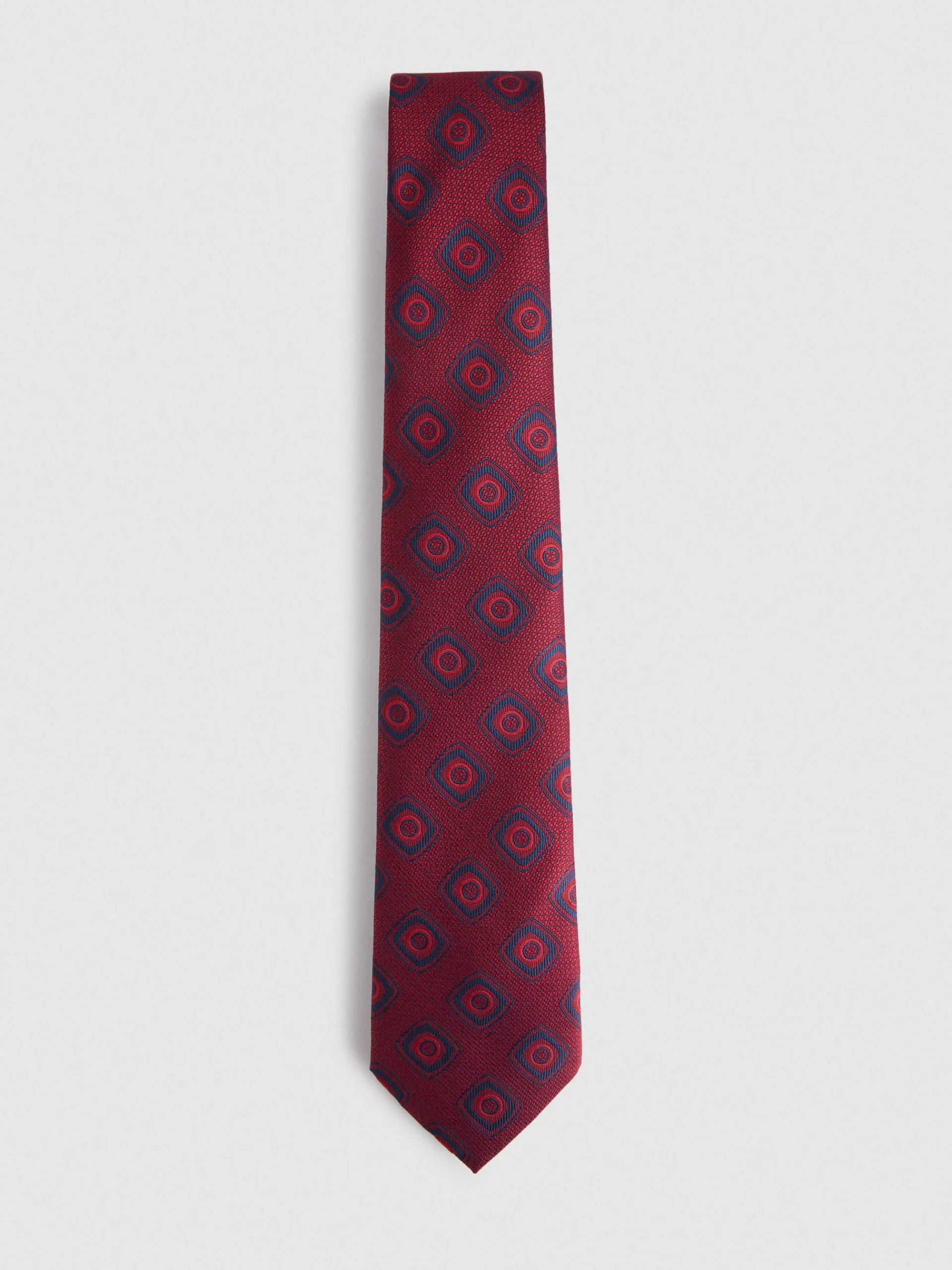 Corbata estilo jacquard con diseño estampado a contraste confeccionada en 100% poliéster. Cuenta con el logo de la marca grabado en el interior.
