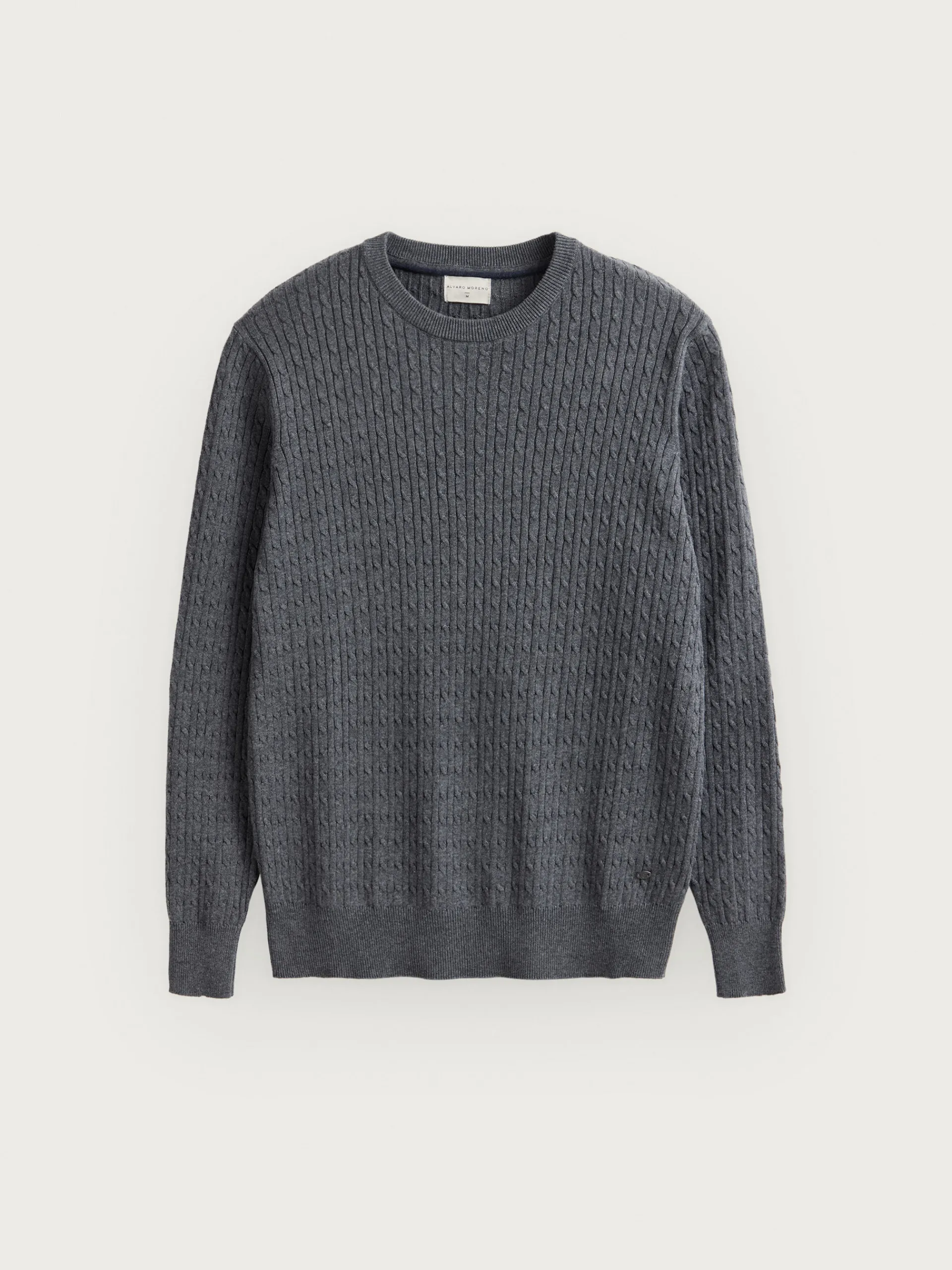 Jersey con estructura estilo ochos confeccionado en algodón. Cuenta con cuello redondo, manga larga y detalle metálico personalizado en el bajo. Cuello, puños y bajo en acabado ribeteado. Corte regular fit.
