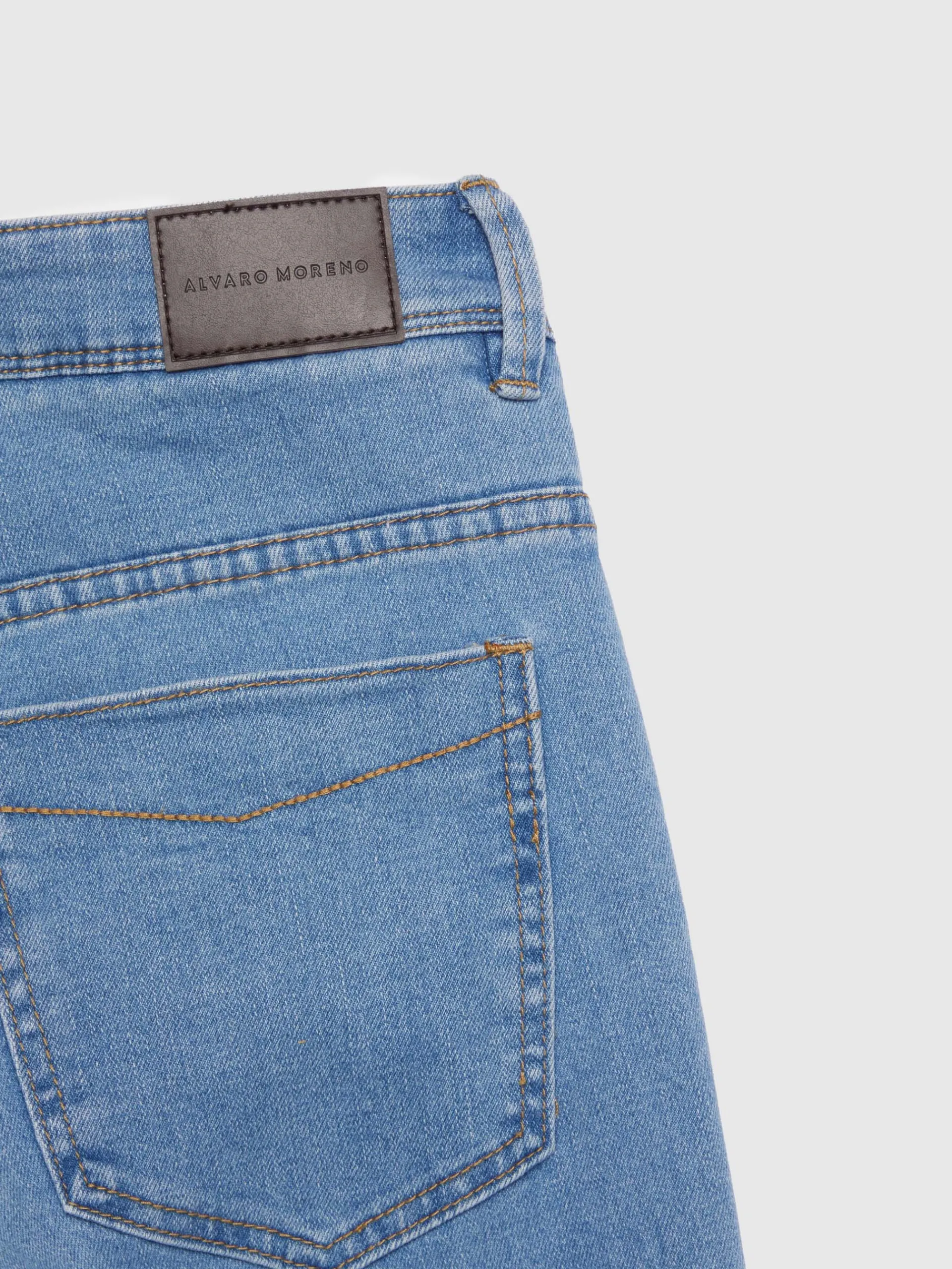 Pantalón denim de corte skinny fit con cinco bolsillos y cierre central mediante botón y cremallera, pespuntes en color camel, fornituras personalizadas y etiqueta en efecto piel en la cinturilla.