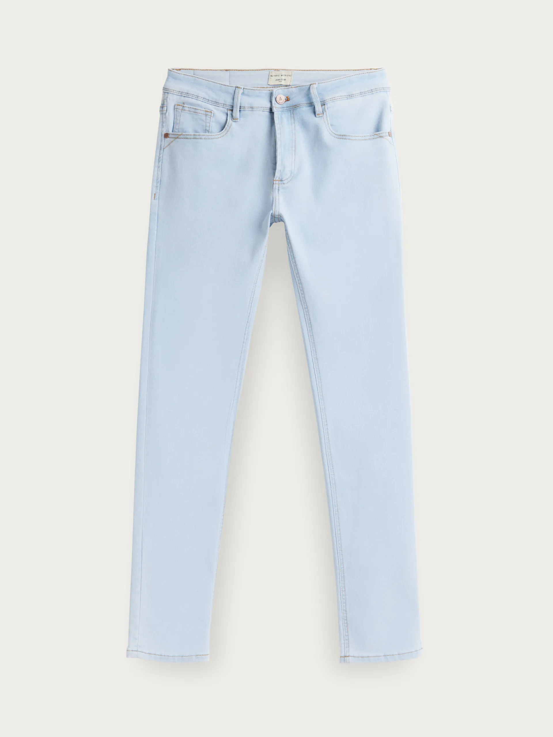 Pantalón denim de corte slim fit con cinco bolsillos y cierre central mediante botón y cremallera, pespuntes en color camel, fornituras personalizadas y etiqueta en efecto piel en la cinturilla.