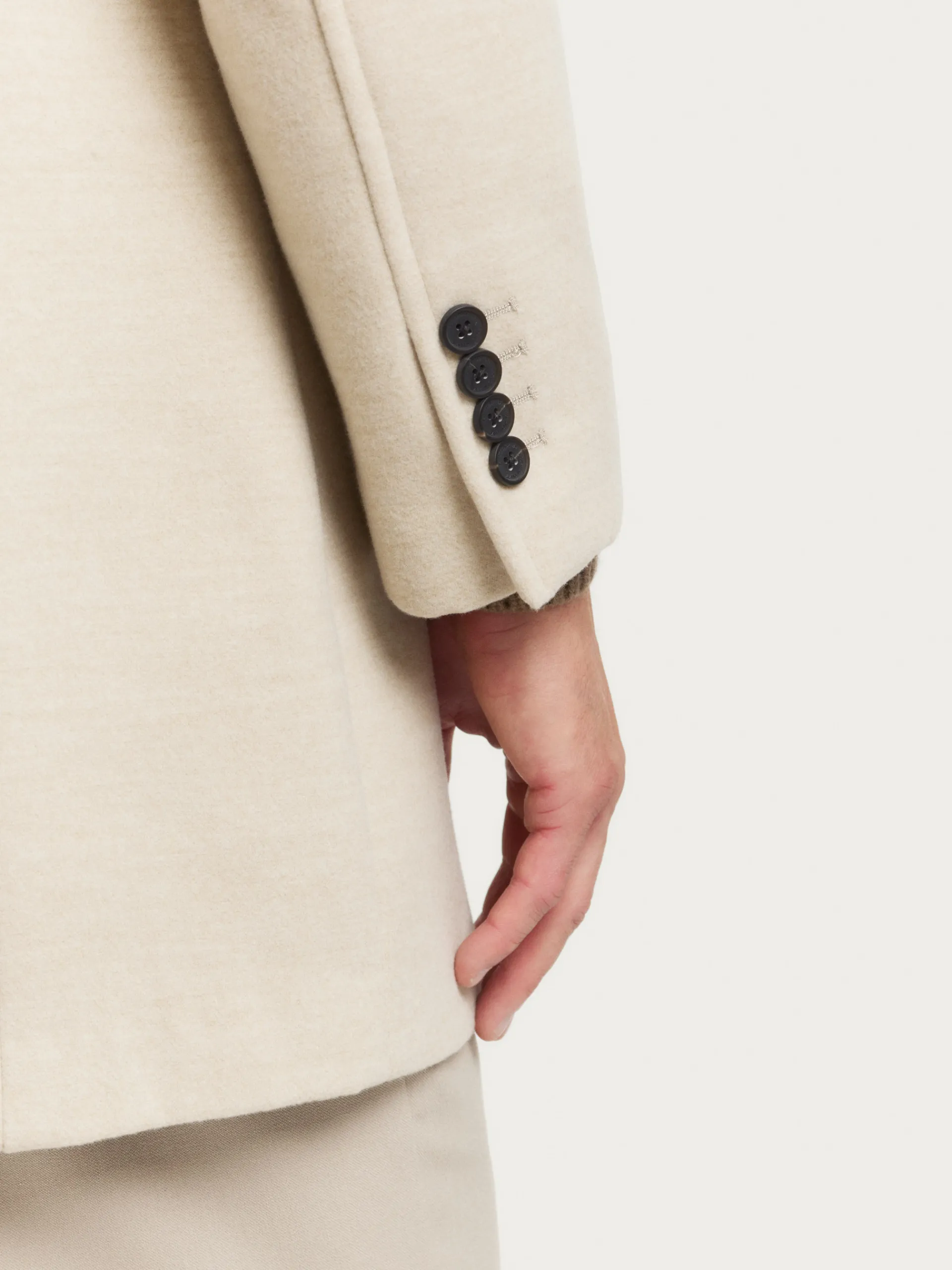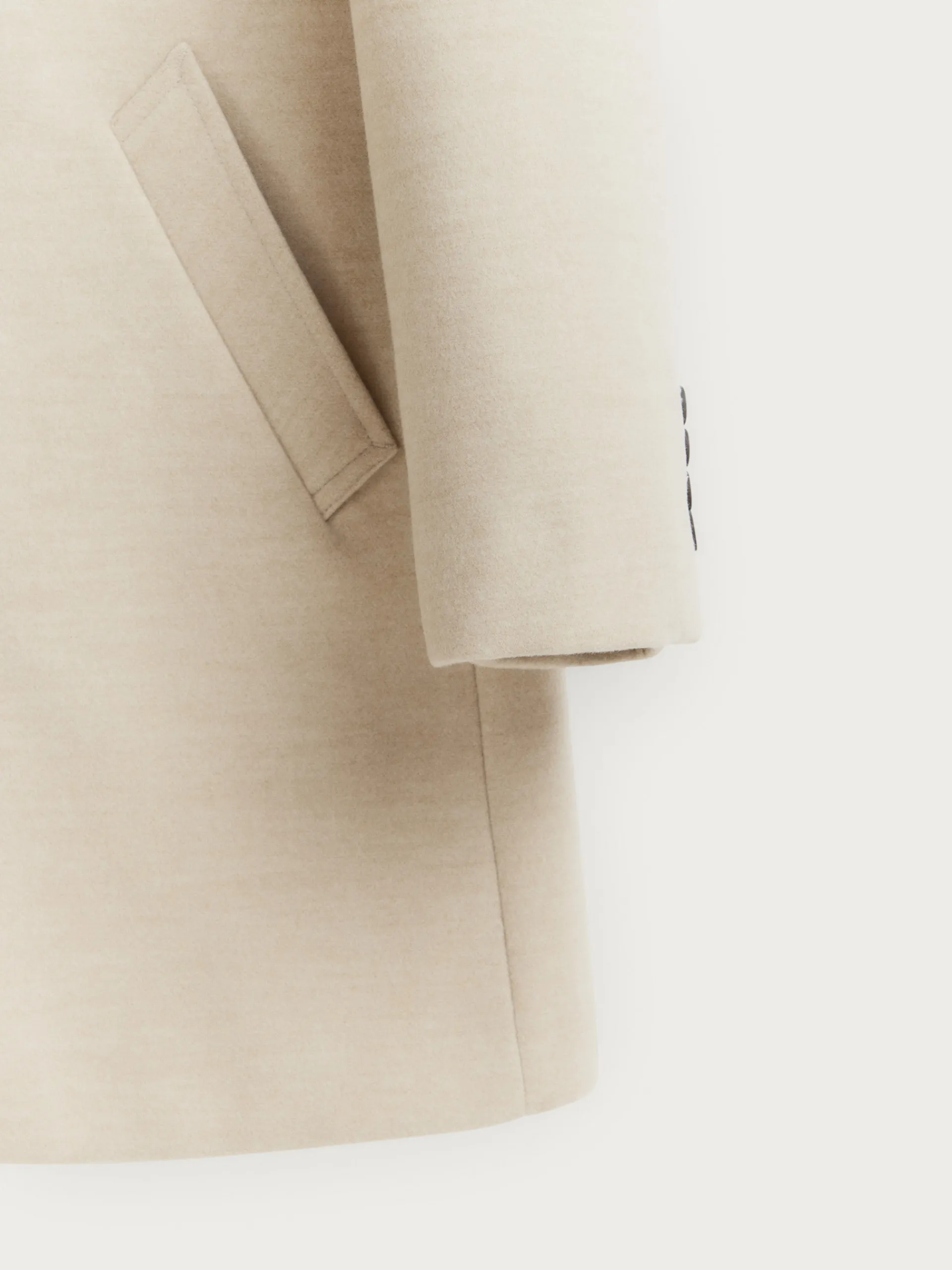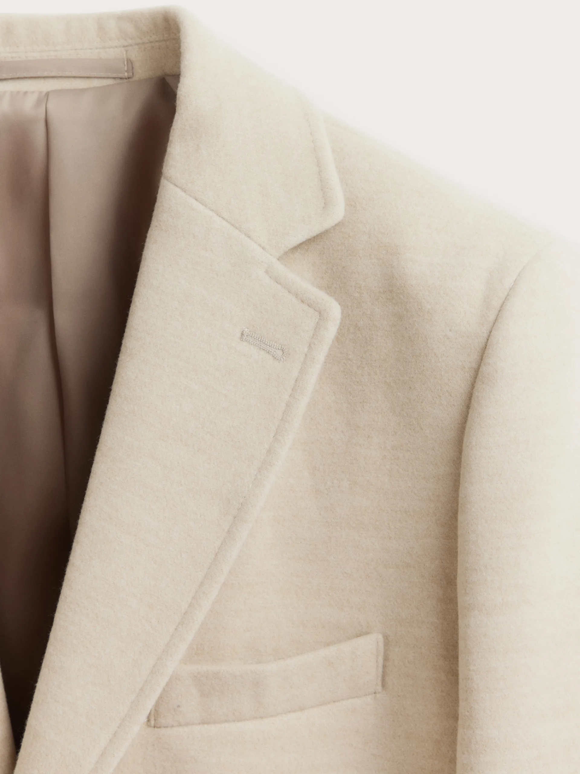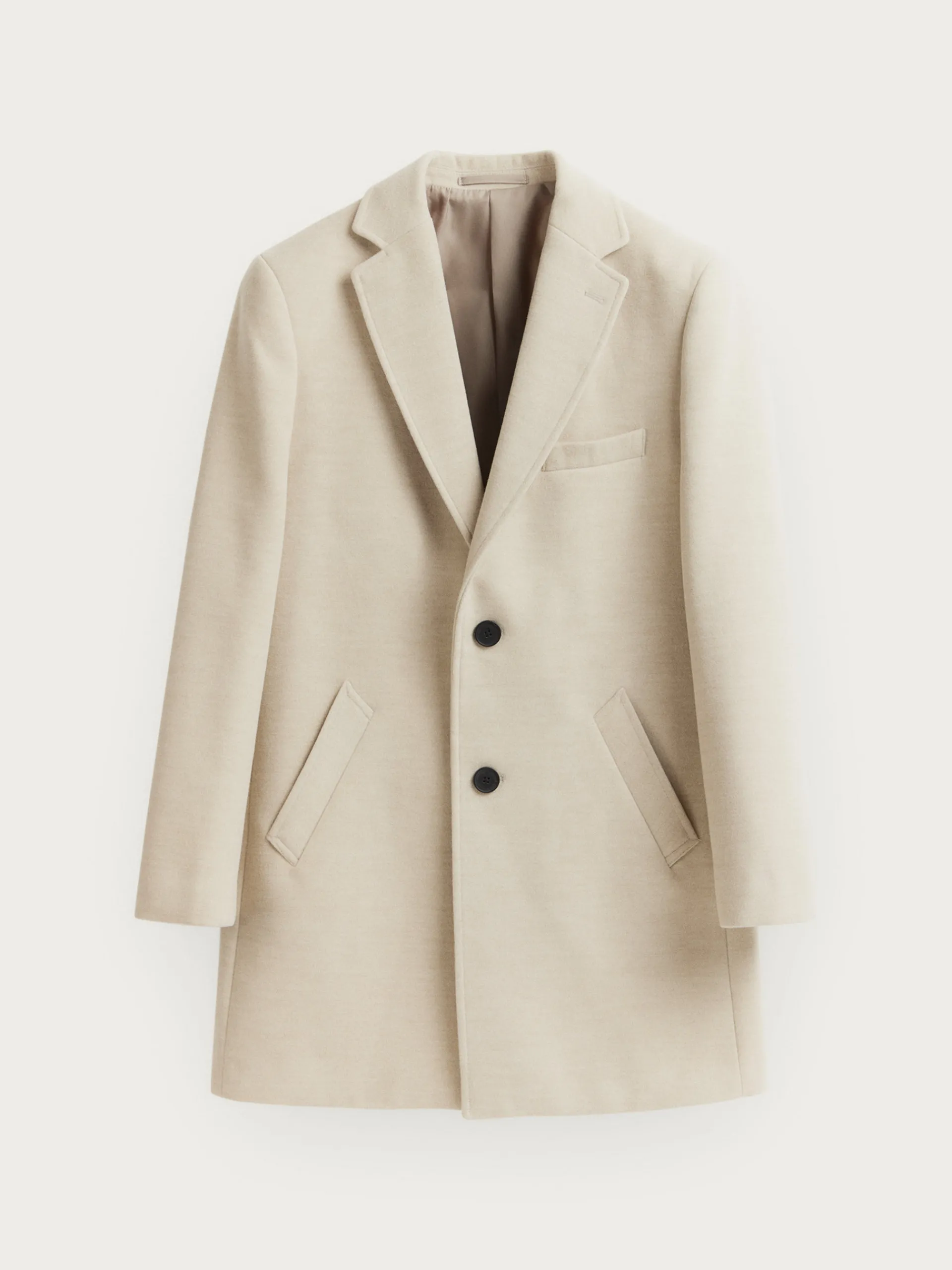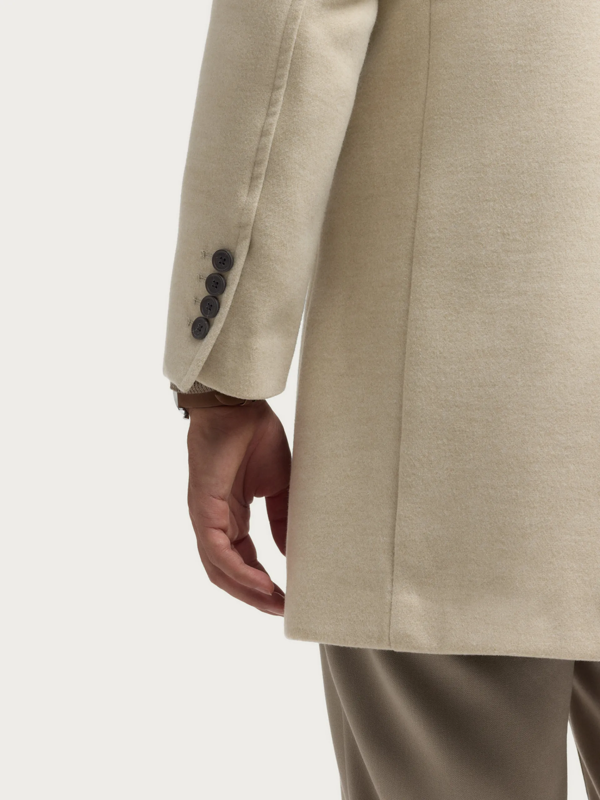 Abrigo de paño liso con cuello y solapa. Cierre central mediante botones, manga larga con botones en su terminación y dos bolsillos a la altura de la cintura. Abertura central en el bajo de la espalda. Corte regular fit.