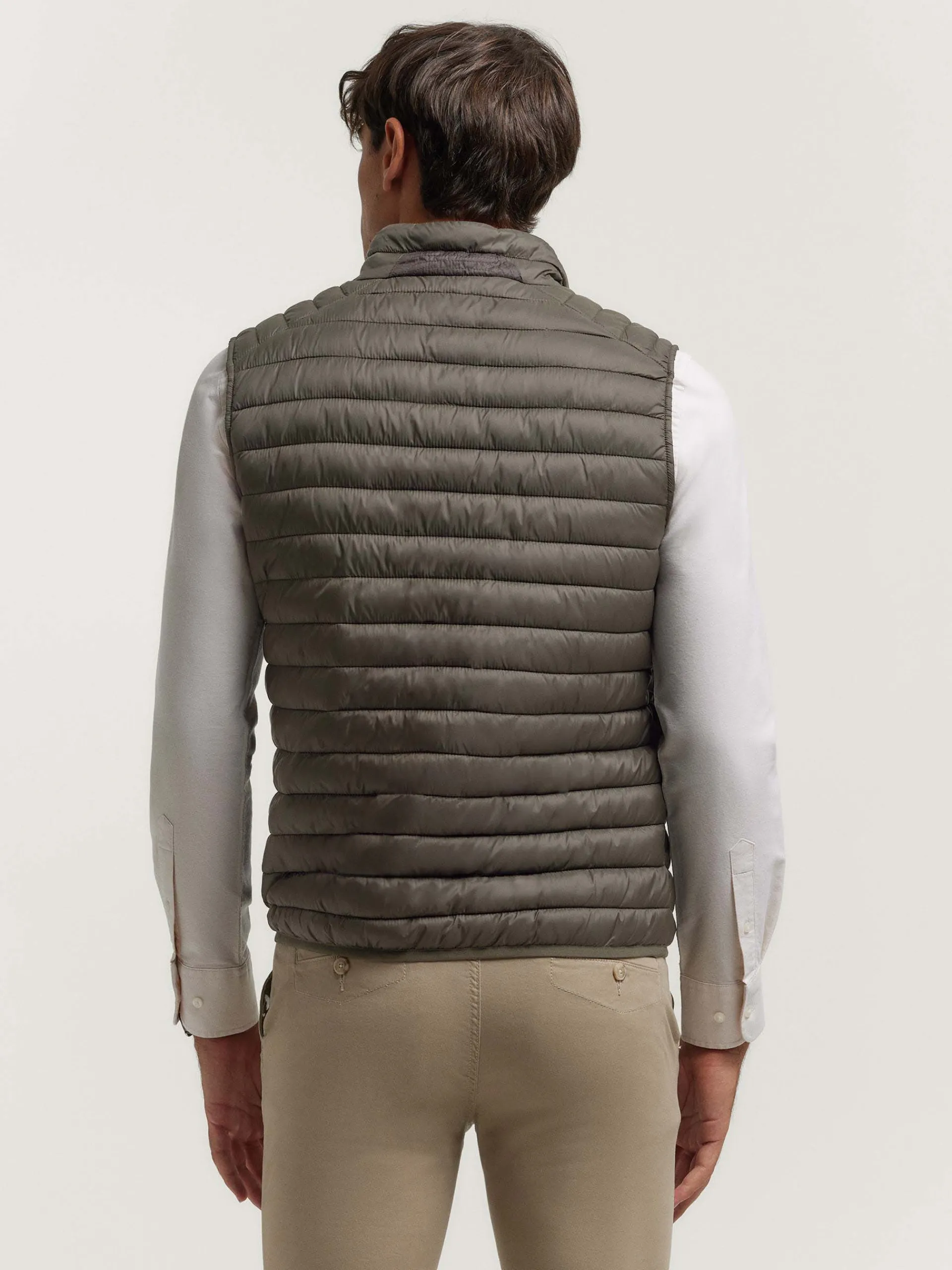 Chaleco acolchado con cuello subido. Cierre central mediante doble cremallera, dos bolsillo a la altura de la cintura y logo de la marca grabado en el pecho. Elástico en la sisa y cintura. Detalle a contraste en la parte trasera del cuello.