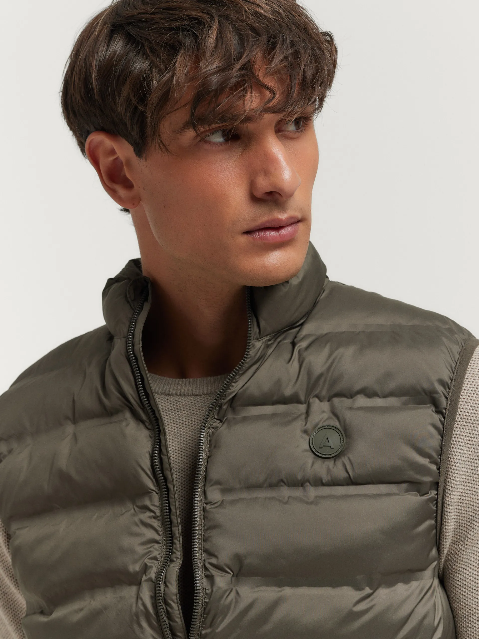 Chaleco acolchado con cuello subido y cierre central mediante cremallera, dos bolsillos a la altura de la cintura y logo de la marca grabado en el pecho al tono. Elástico en la sisa y cintura. Forro interior a contraste con bolsillos.