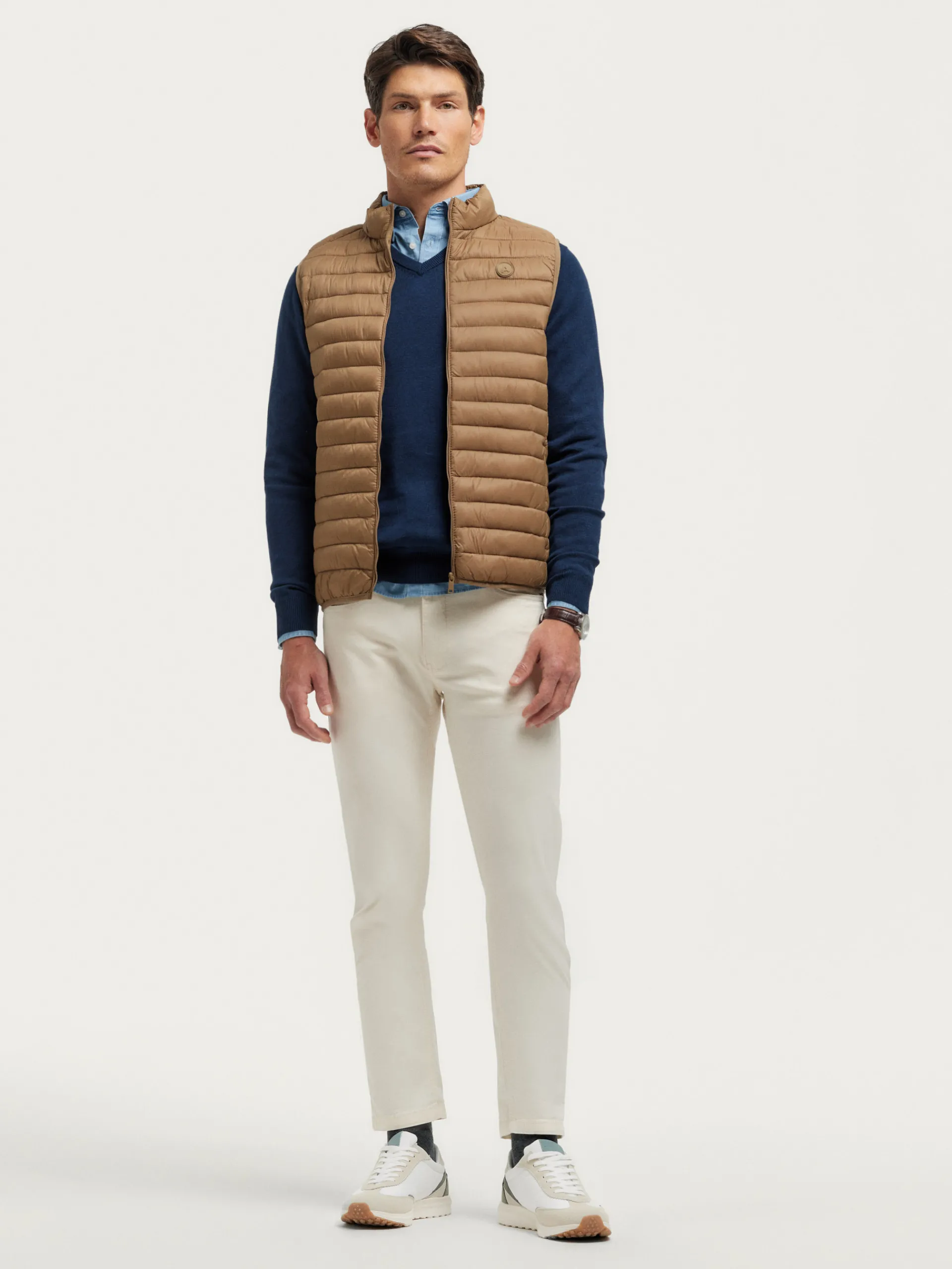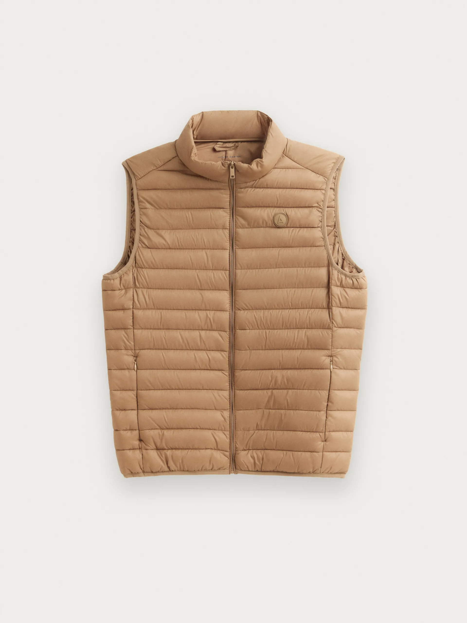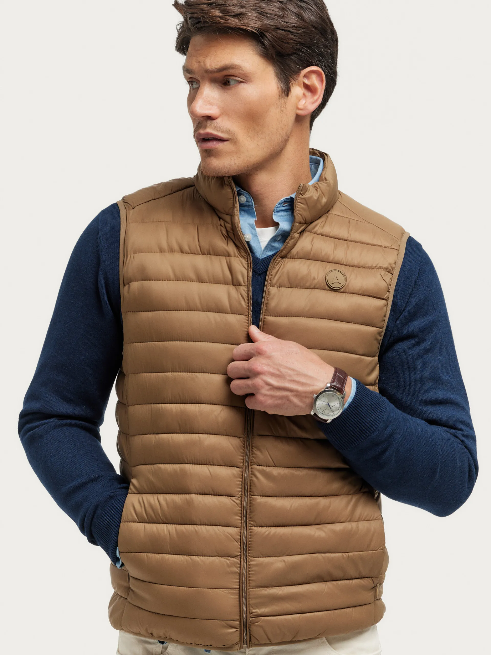 Chaleco acolchado con cuello subido y cierre central mediante cremallera, dos bolsillos a la altura de la cintura y logo de la marca grabado en el pecho. Elástico en la sisa y cintura. Forro interior a contraste con bolsillos.