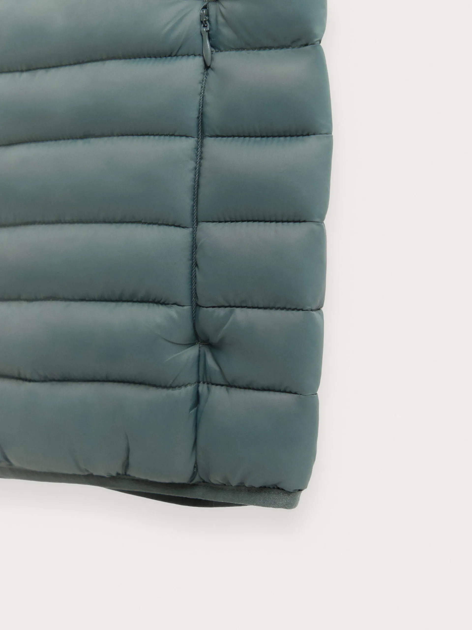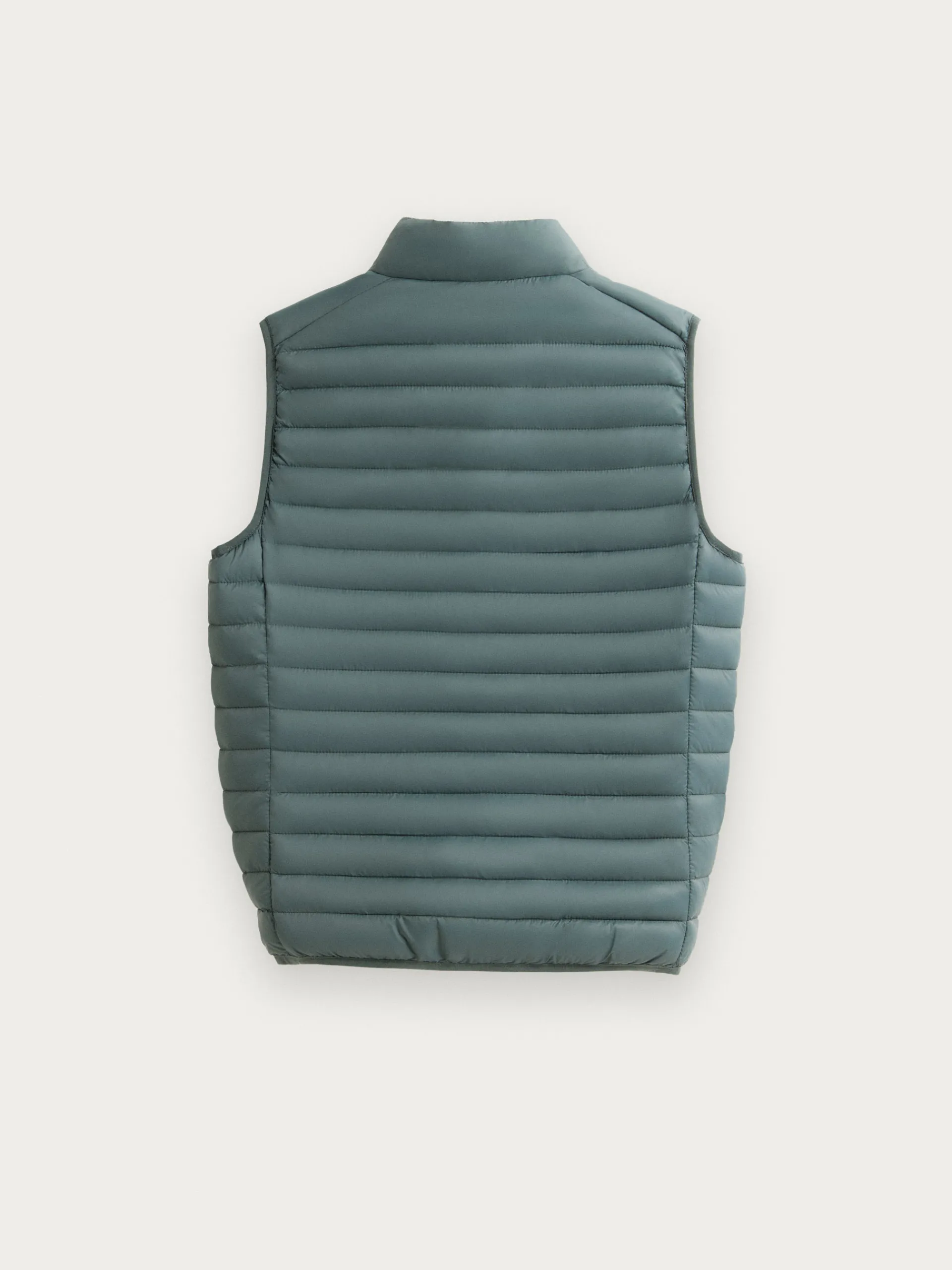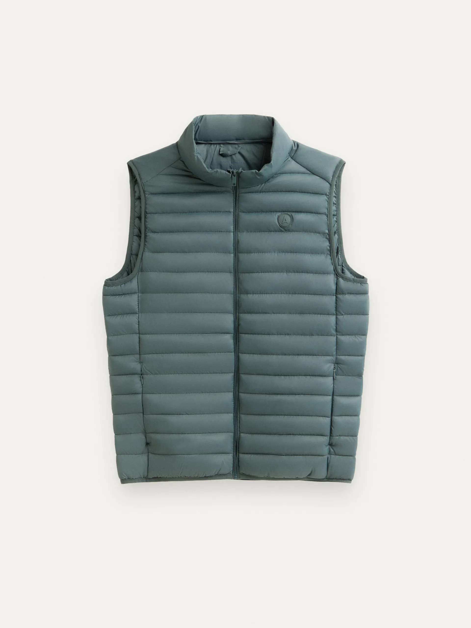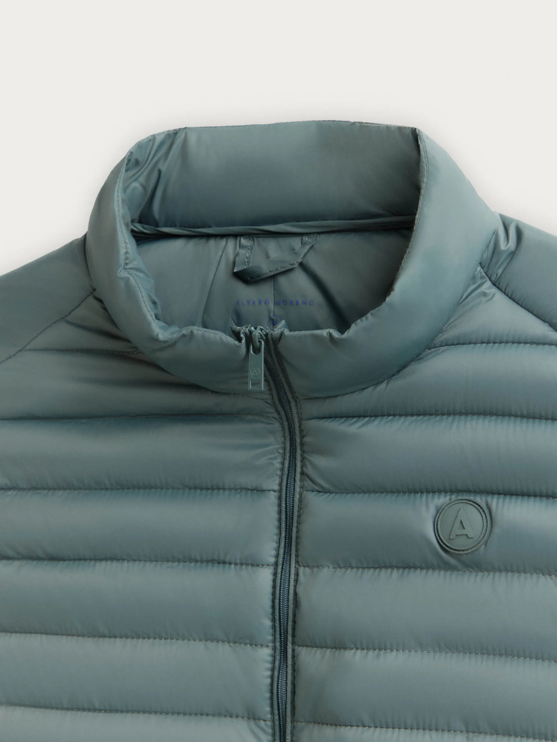 Chaleco acolchado con cuello subido y cierre central mediante cremallera, dos bolsillos a la altura de la cintura y logo de la marca grabado en el pecho. Elástico en la sisa y cintura. Forro interior a contraste con bolsillos.