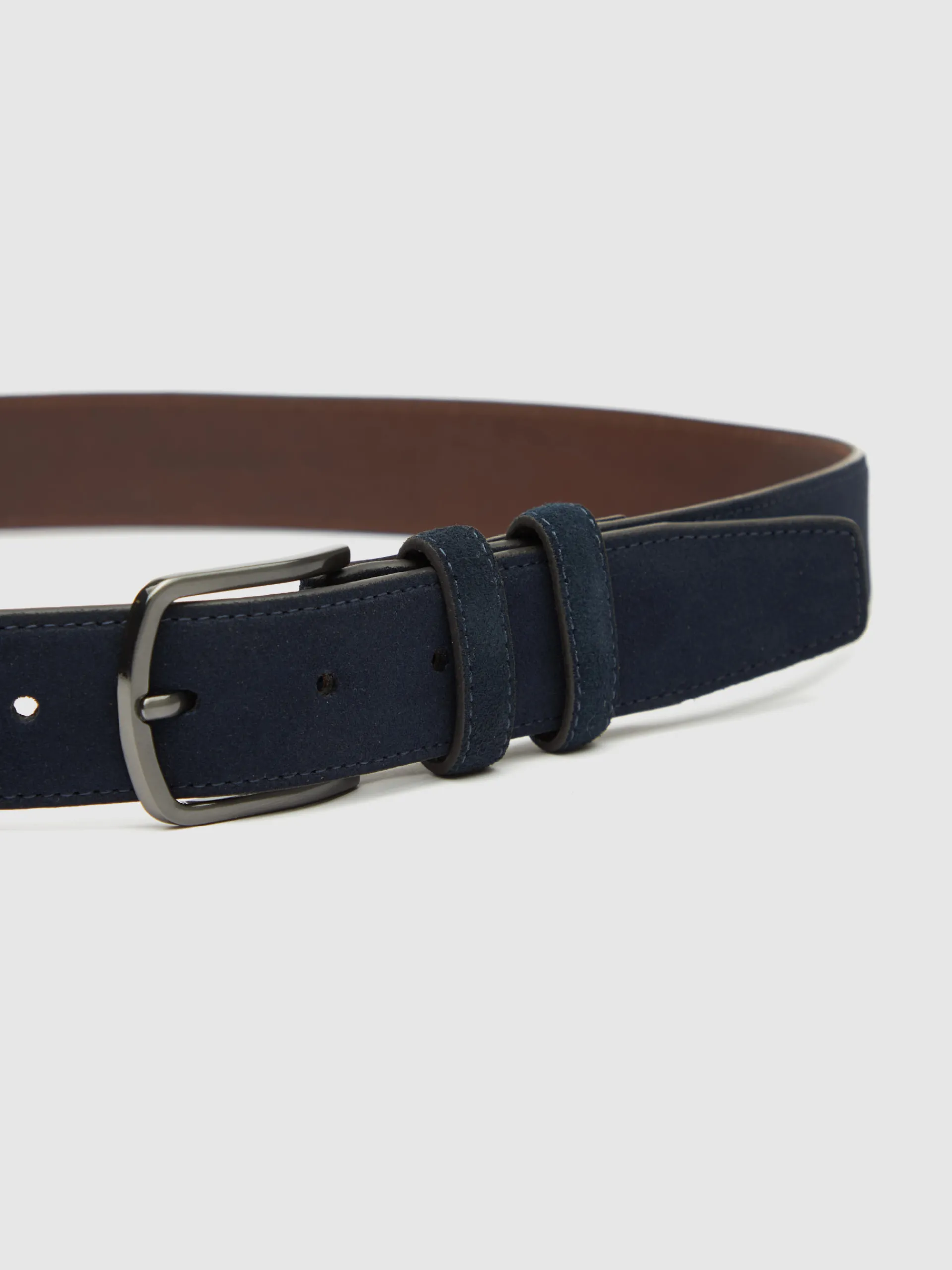 Cinturón confeccionado en piel con cierre central mediante hebilla metálica, pasador al tono y pespuntes al tono.