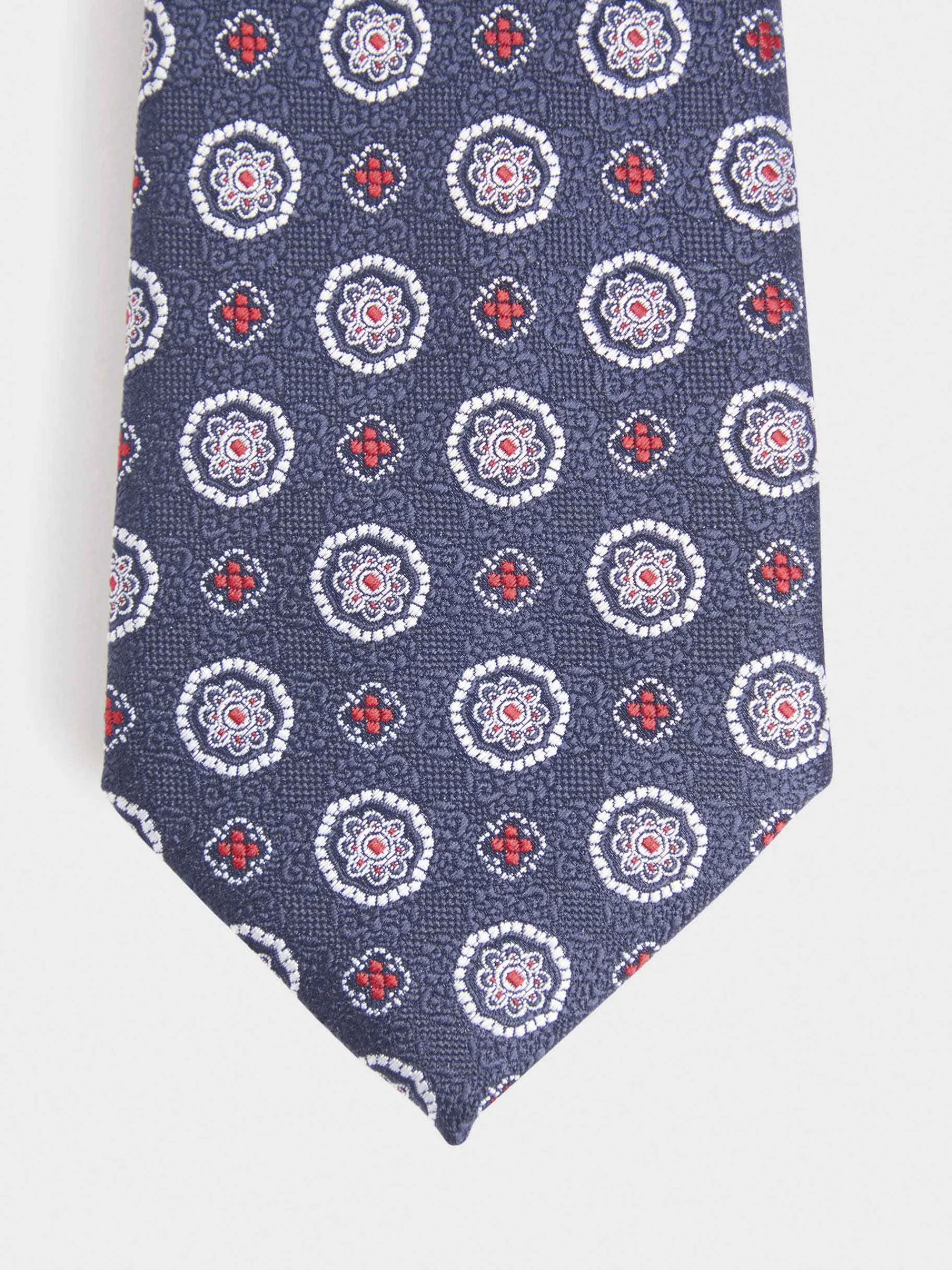 Corbata estilo jacquard con diseño estampado a contraste confeccionada en 100% poliéster. Cuenta con el logo de la marca grabado en el interior.