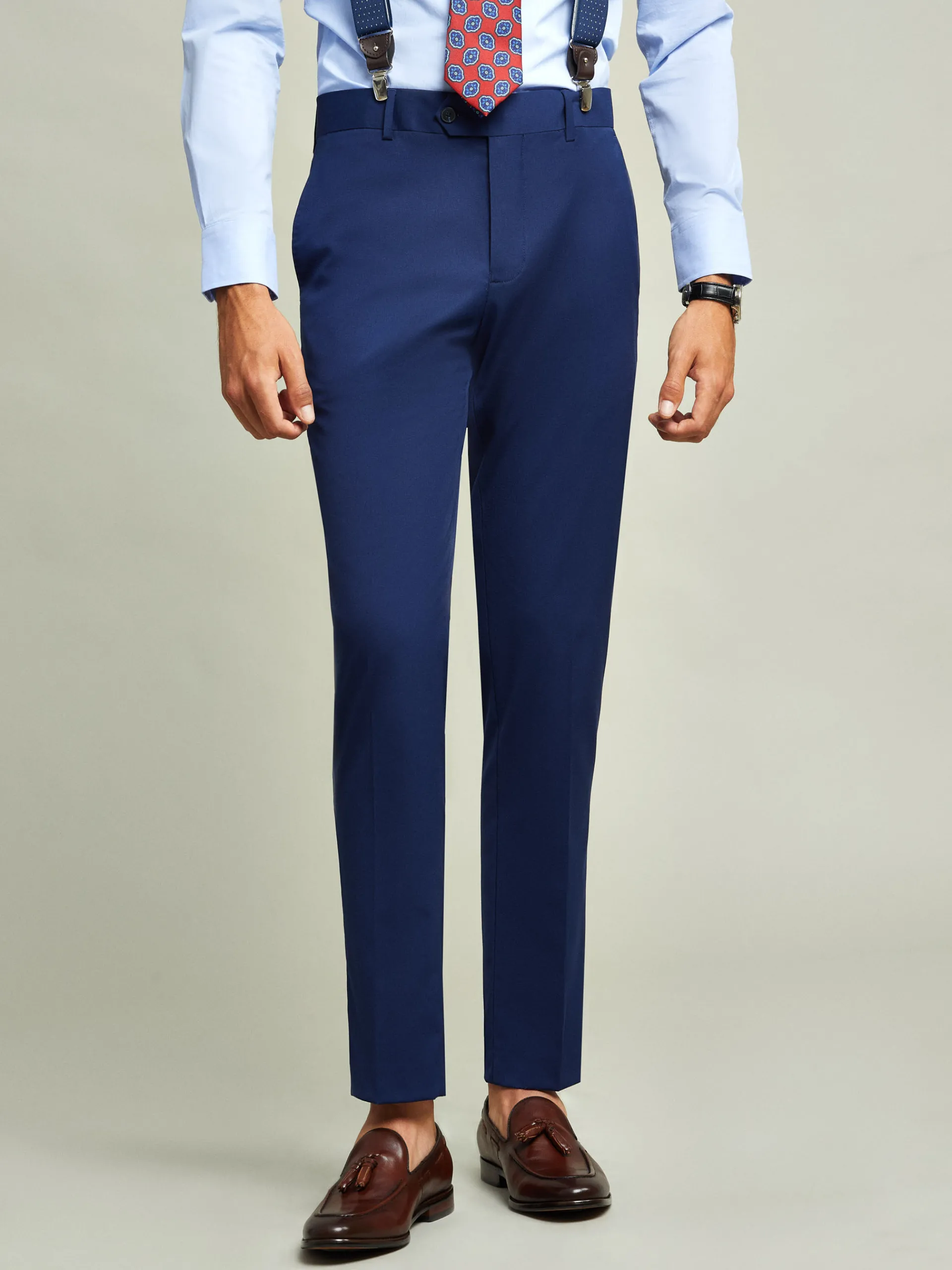 Pantalón de traje de corte slim fit con cierre frontal de cremallera y botones, dos bolsillos en la parte delantera y dos bolsillos traseros con cierre mediante botón. Forrado interiormente.