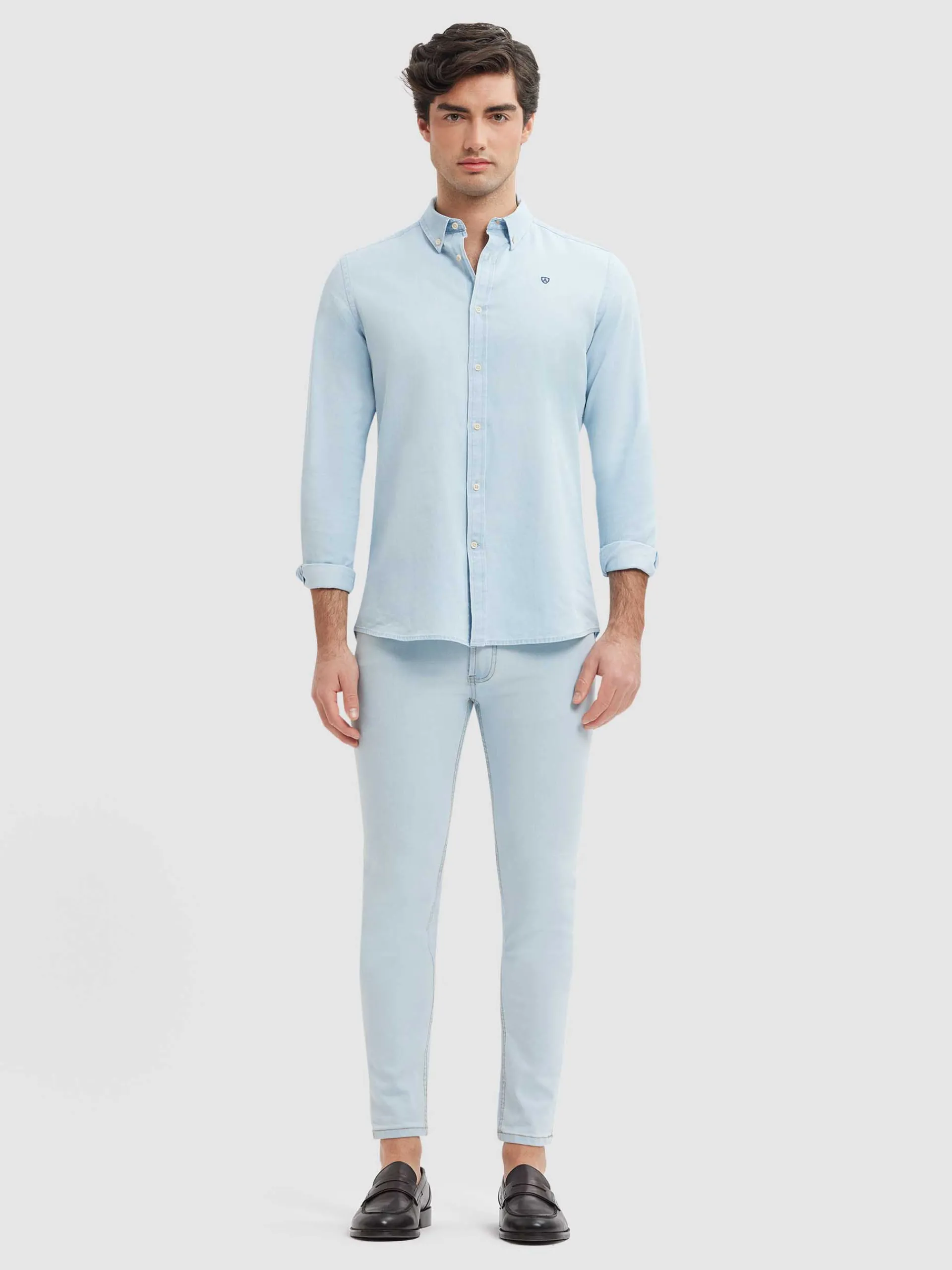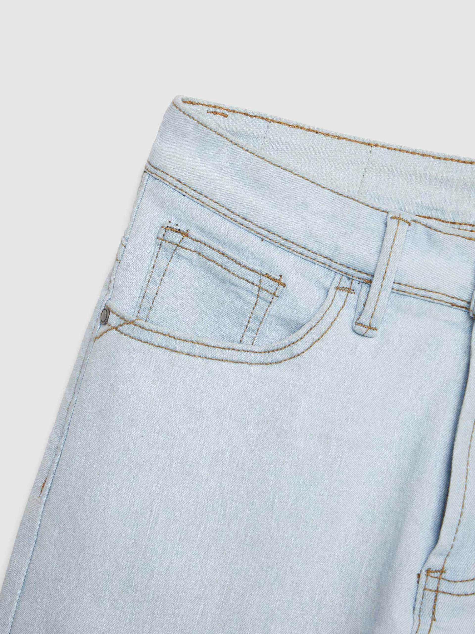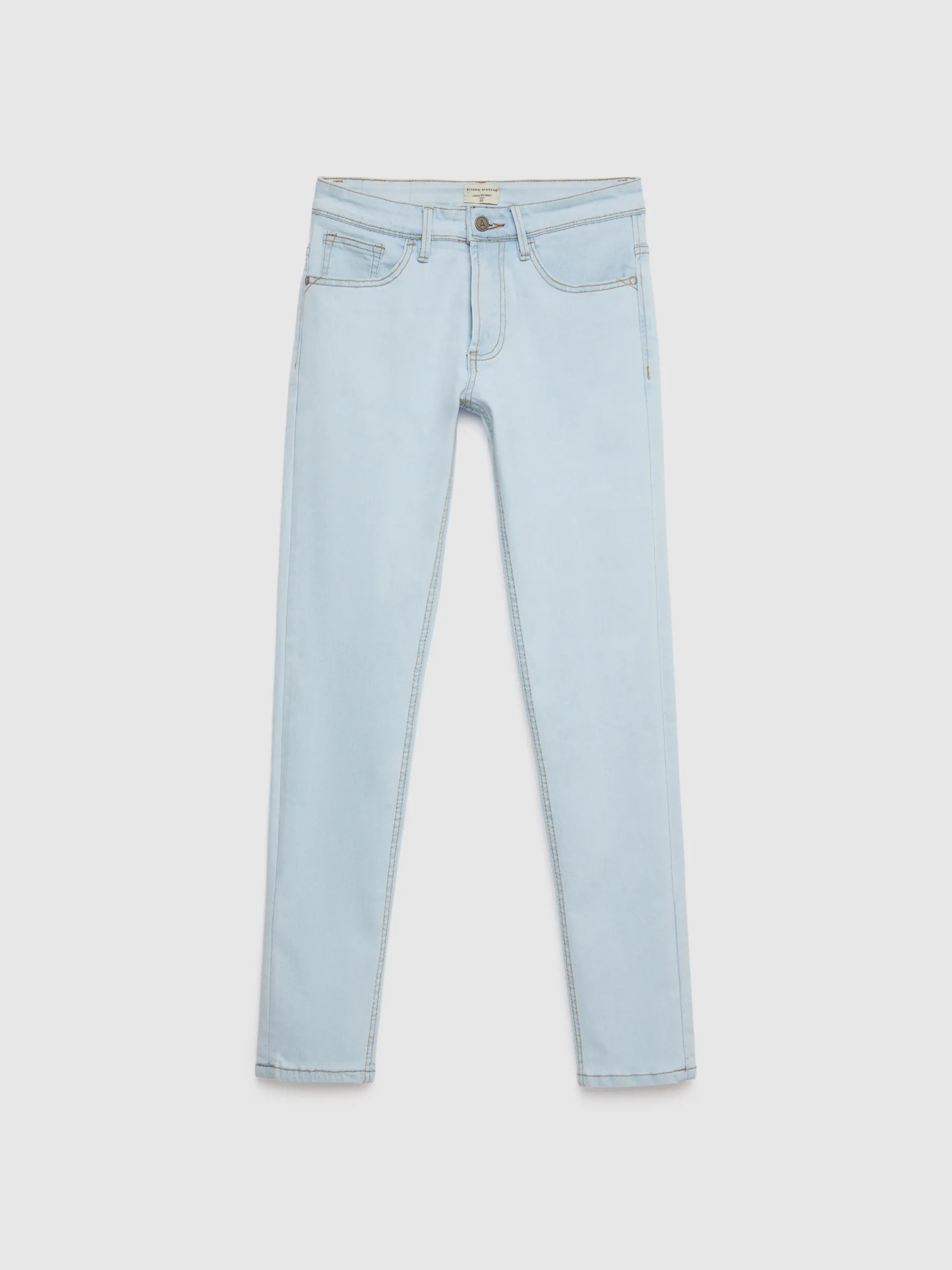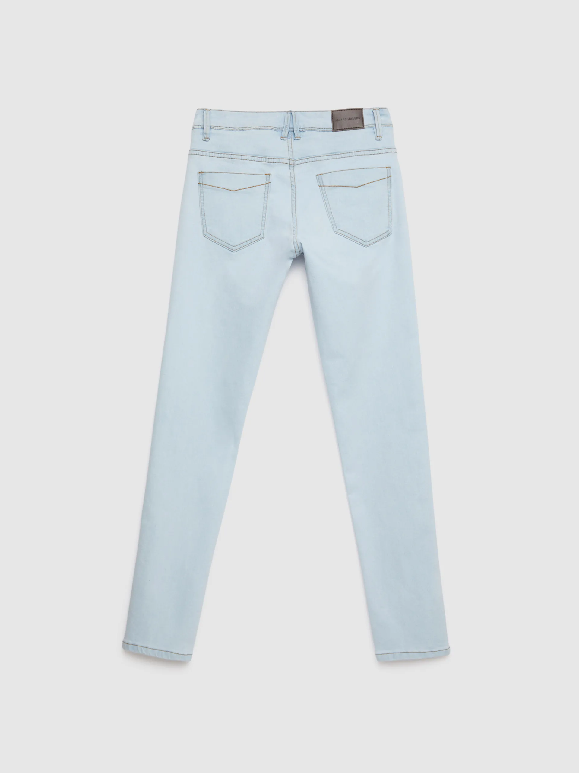 Pantalón denim de corte skinny fit con cinco bolsillos y cierre central mediante botón y cremallera, pespuntes en color camel, fornituras personalizadas y etiqueta en efecto piel en la cinturilla.