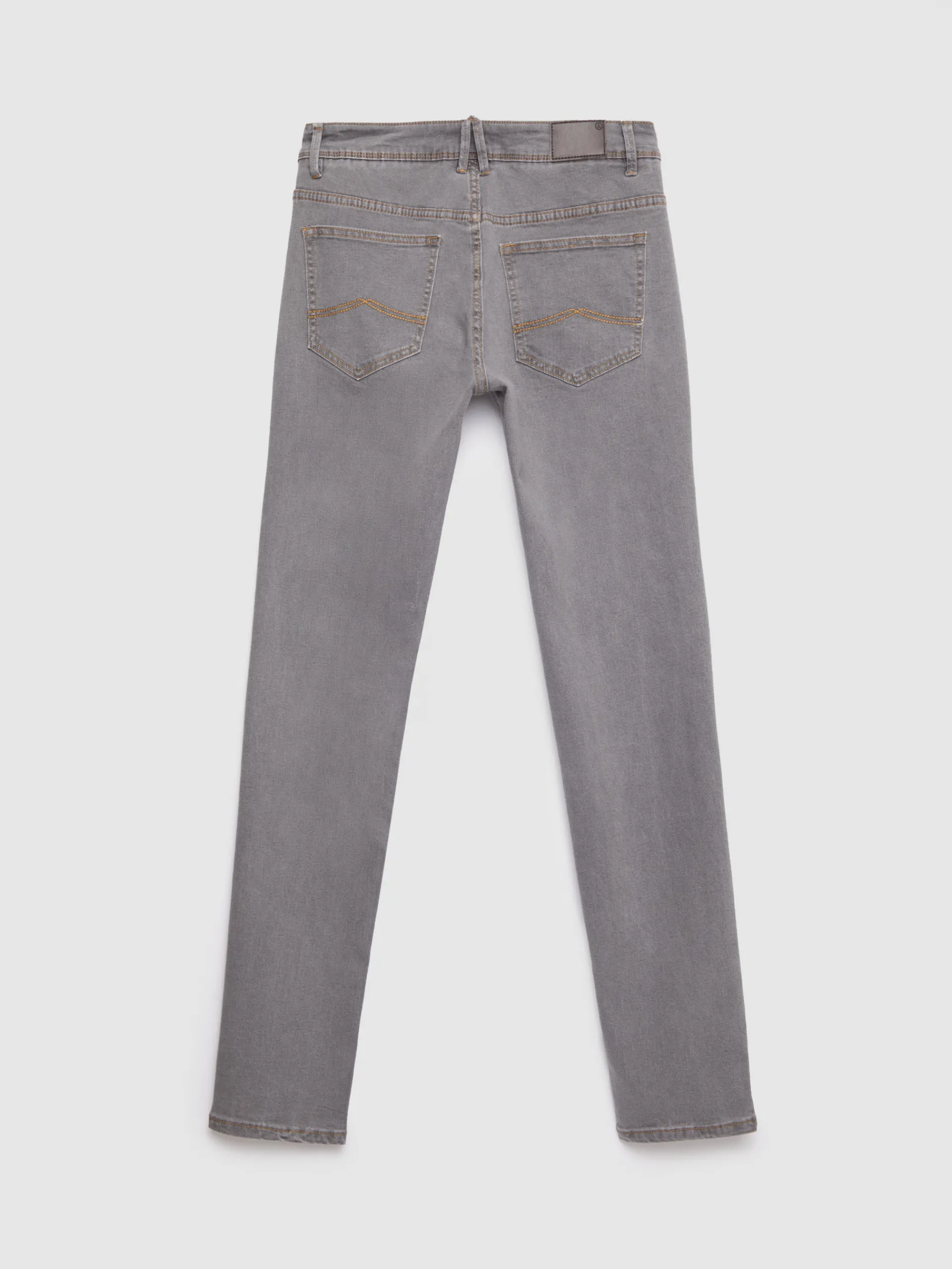 Pantalón denim de corte slim fit con cinco bolsillos y cierre central mediante botón y cremallera, pespuntes en color camel, fornituras personalizadas y etiqueta en efecto piel en la cinturilla.